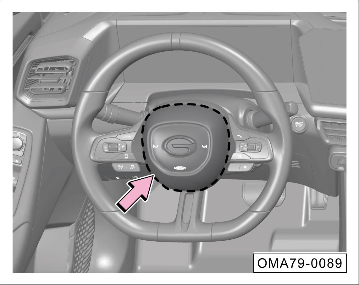 驾驶员正面安全气囊安装在方向盘内部(虚线阴影部分),方向盘上标有“AIRBAG”标志。