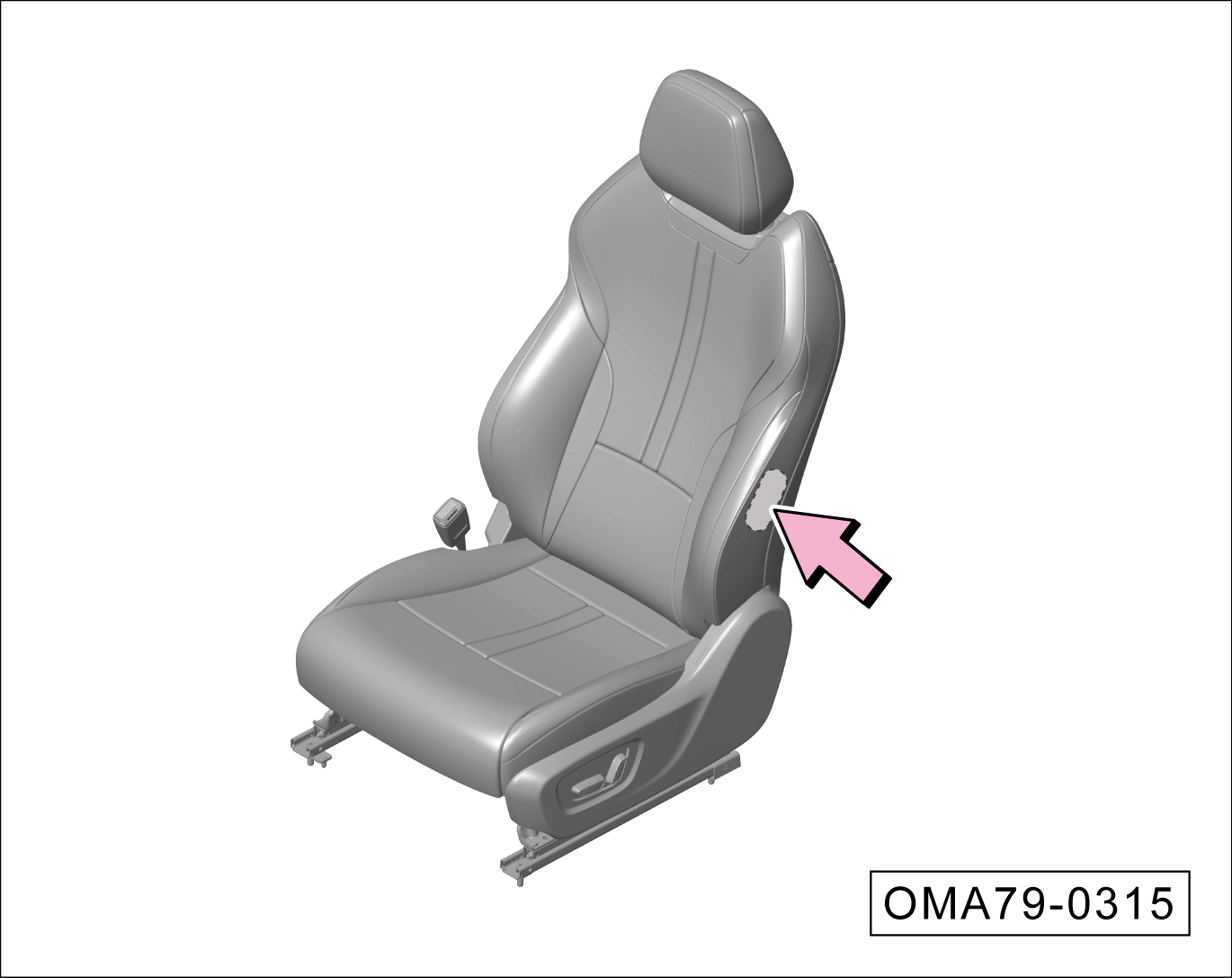前排侧面安全气囊安装在驾驶员座椅及前排乘员座椅靠背向门侧内部(虚线阴影部分),前排座椅外侧标有“AIRBAG”标志。