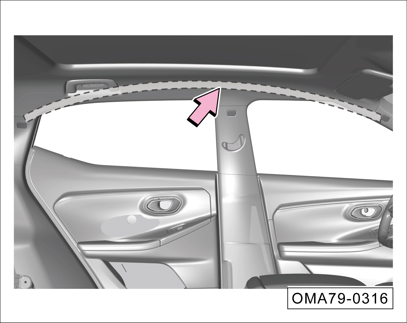 侧窗帘式安全气囊安装在顶棚左、右两侧内部(虚线阴影部分),顶棚两侧饰板标有“AIRBAG”标志。