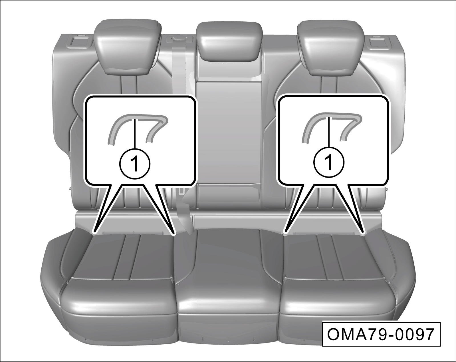 第二排座椅的前固定点①隐藏在坐垫缝隙中。