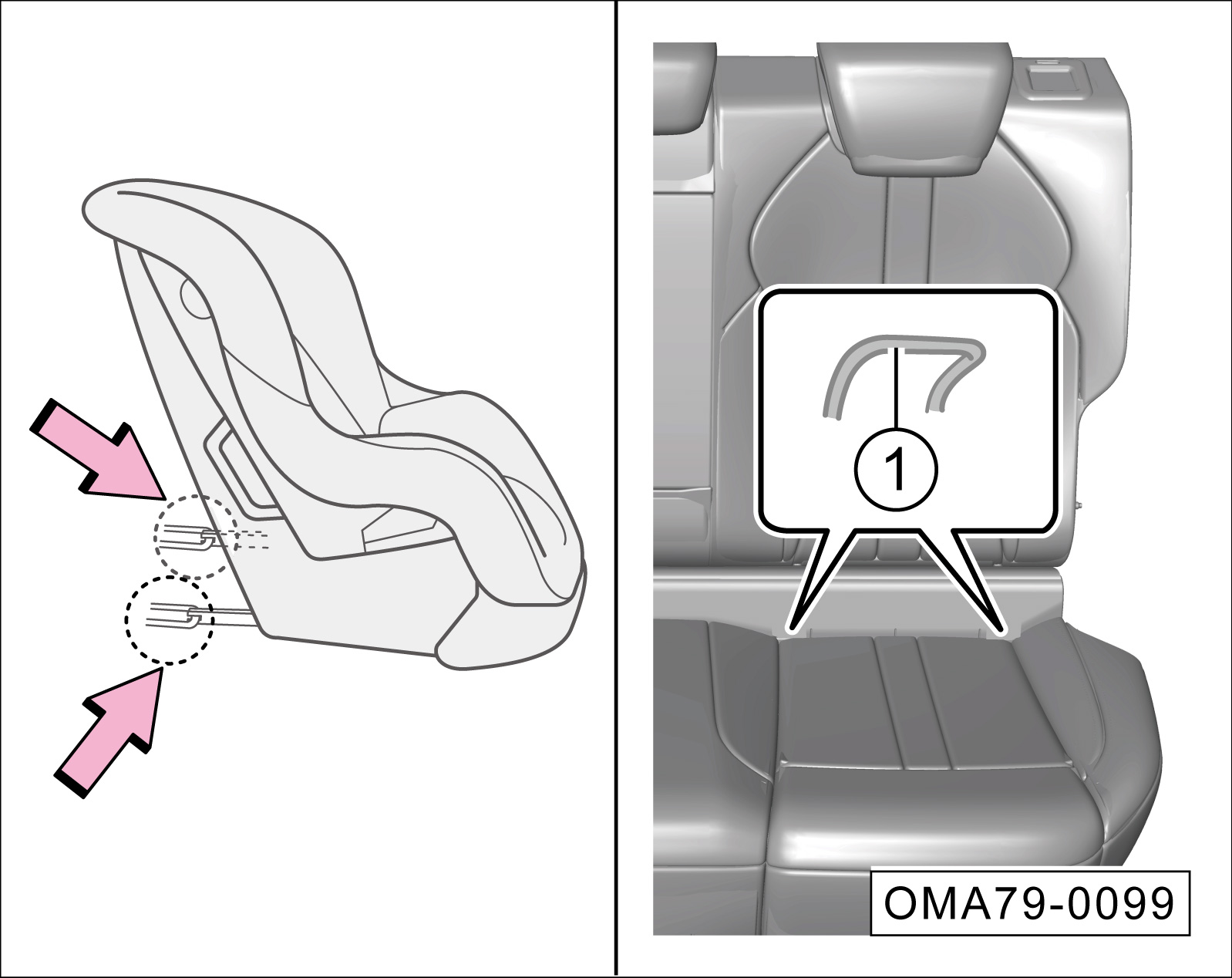 将儿童安全座椅放到座椅上,找到前固定点①,并将儿童安全座椅下安装导槽–箭头–插入前固定点①上,直到听到扣合声。