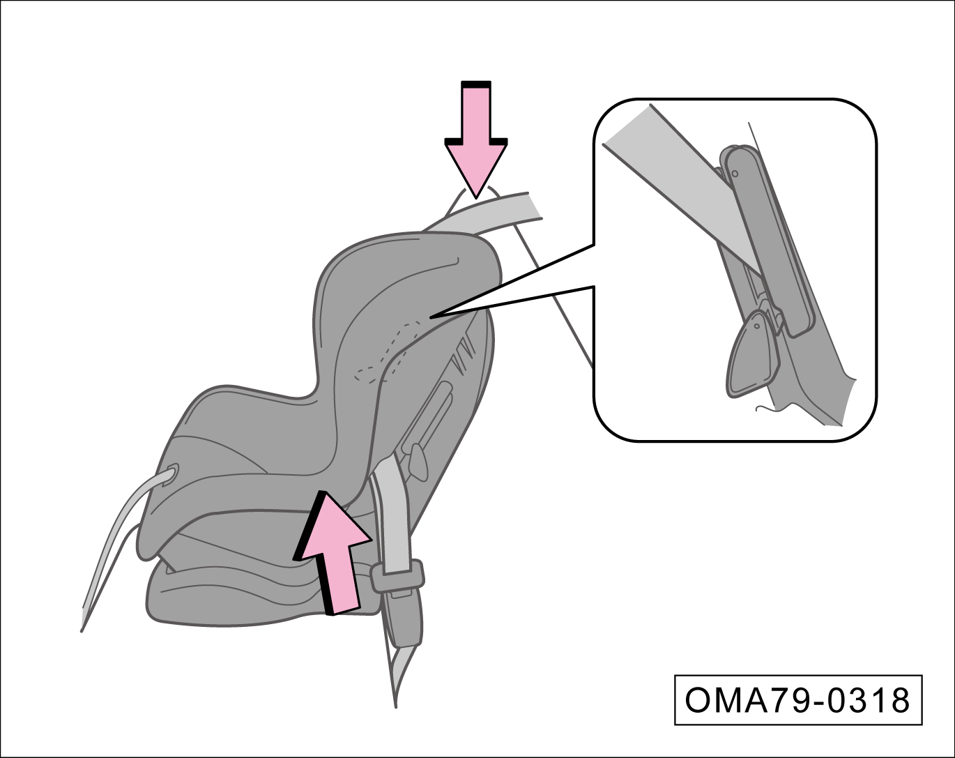 抓住锁扣附近的肩部安全带,向上拉起使腰部安全带不再松弛。此时,用自身重量压在儿童安全座椅上并将其推入车辆座椅。