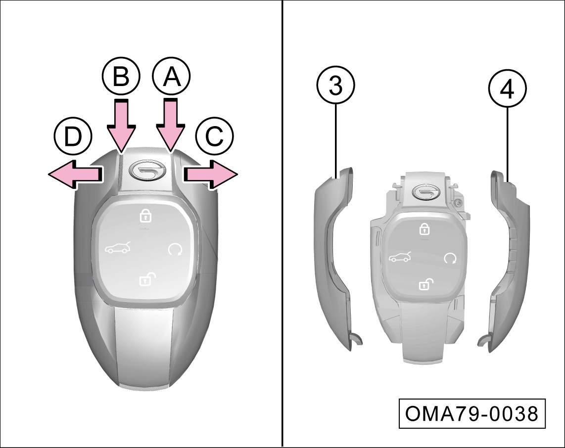 取下遥控钥匙镀铬外壳③和④。