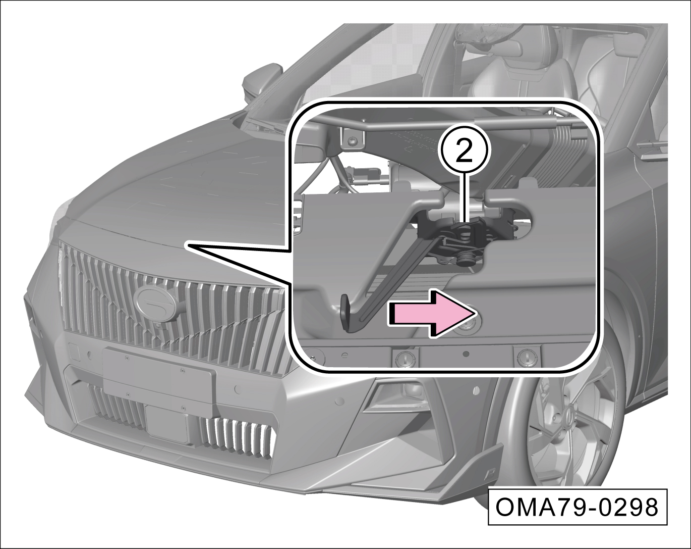 沿-箭头-方向推锁止机构②,可完全解锁前机舱盖。
