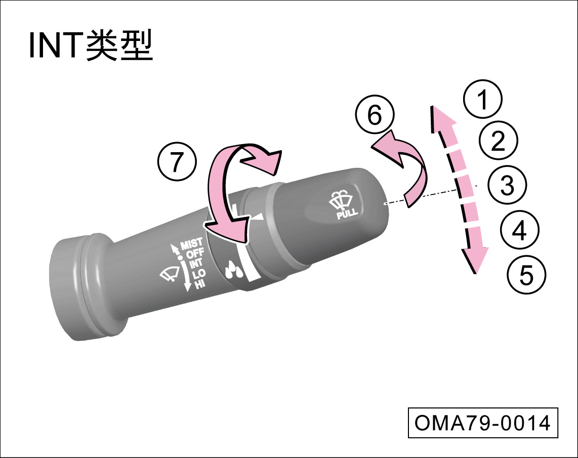 从初始位置拨动刮水器组合开关至限位①MIST位置后松手,刮水器组合开关回到初始位置,前刮水器将刮刷一次后停止运动。