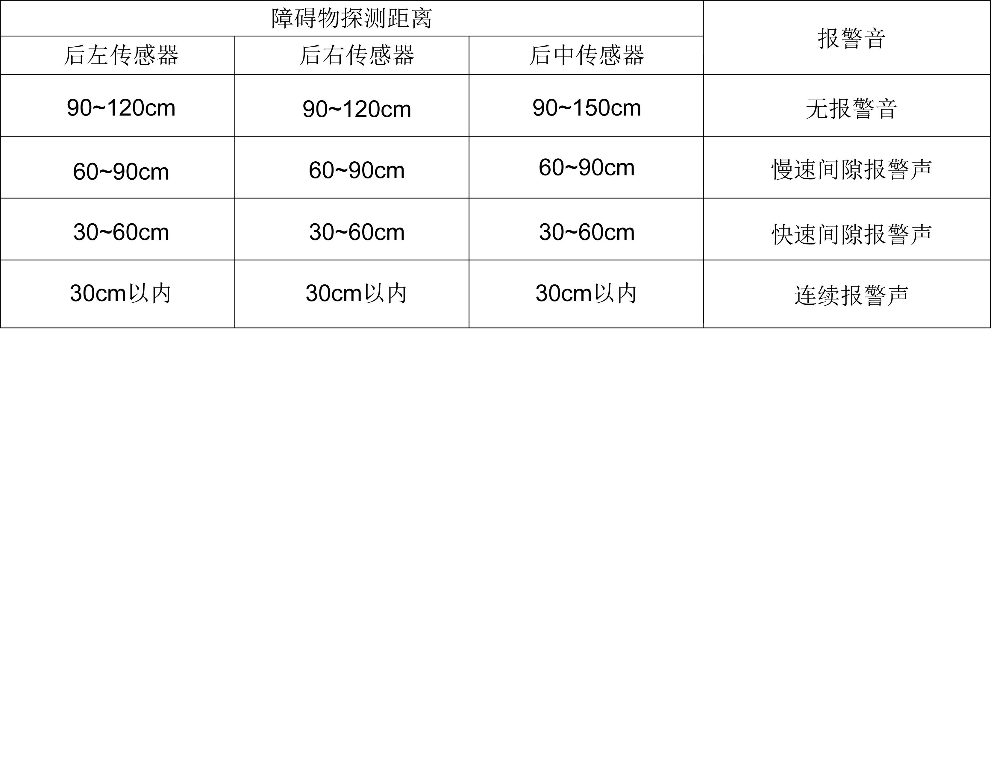 报警声随着障碍物与后保险杠之间的距离变化,同时在音响系统显示屏上显示的颜色也相应变化。若车辆接近障碍物,系统将发出声响警报,车辆越接近障碍物,警报声越短促;距障碍物非常近时系统将发出持续的警报声。若此时车辆继续接近障碍物,系统将不再能探测到障碍物。