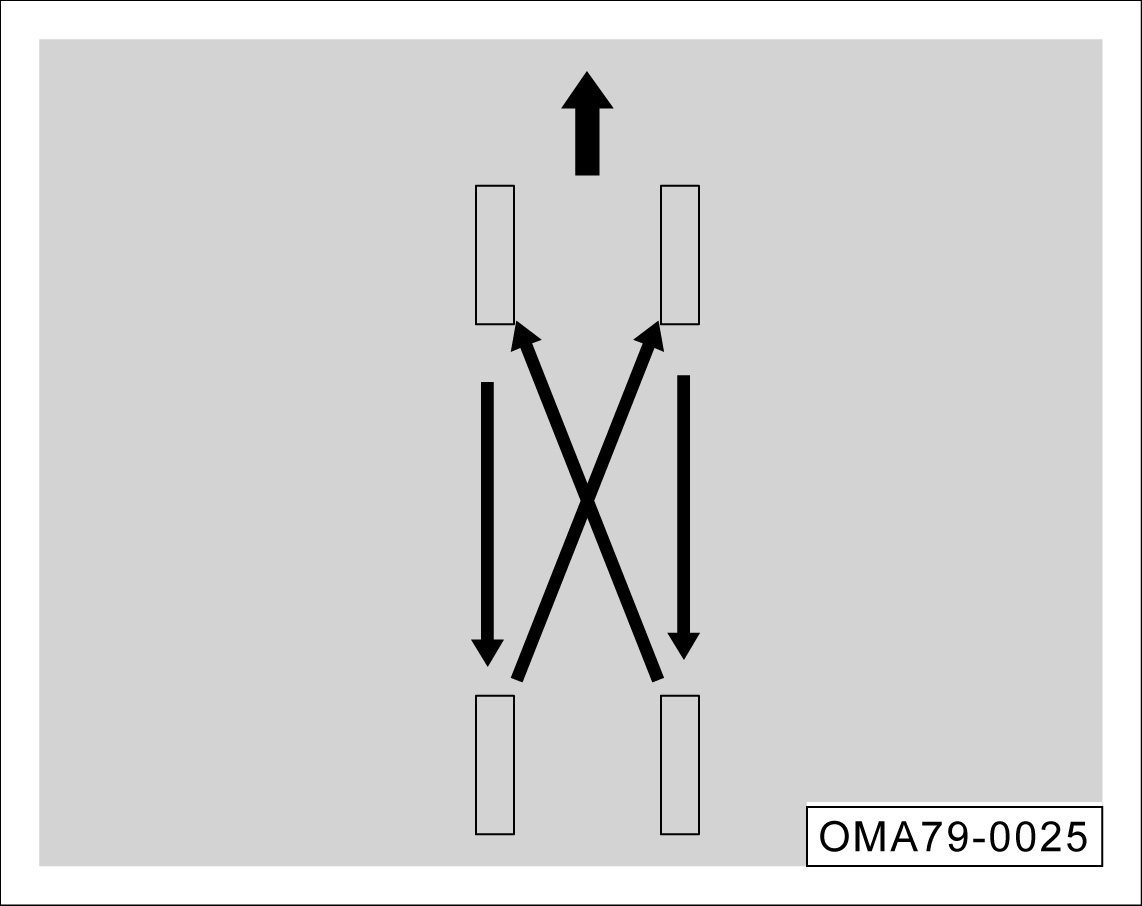 若前轮轮胎的磨损比后轮严重,建议如图所示将前后轮换位安装,从而使所有轮胎的使用寿命大致相同。