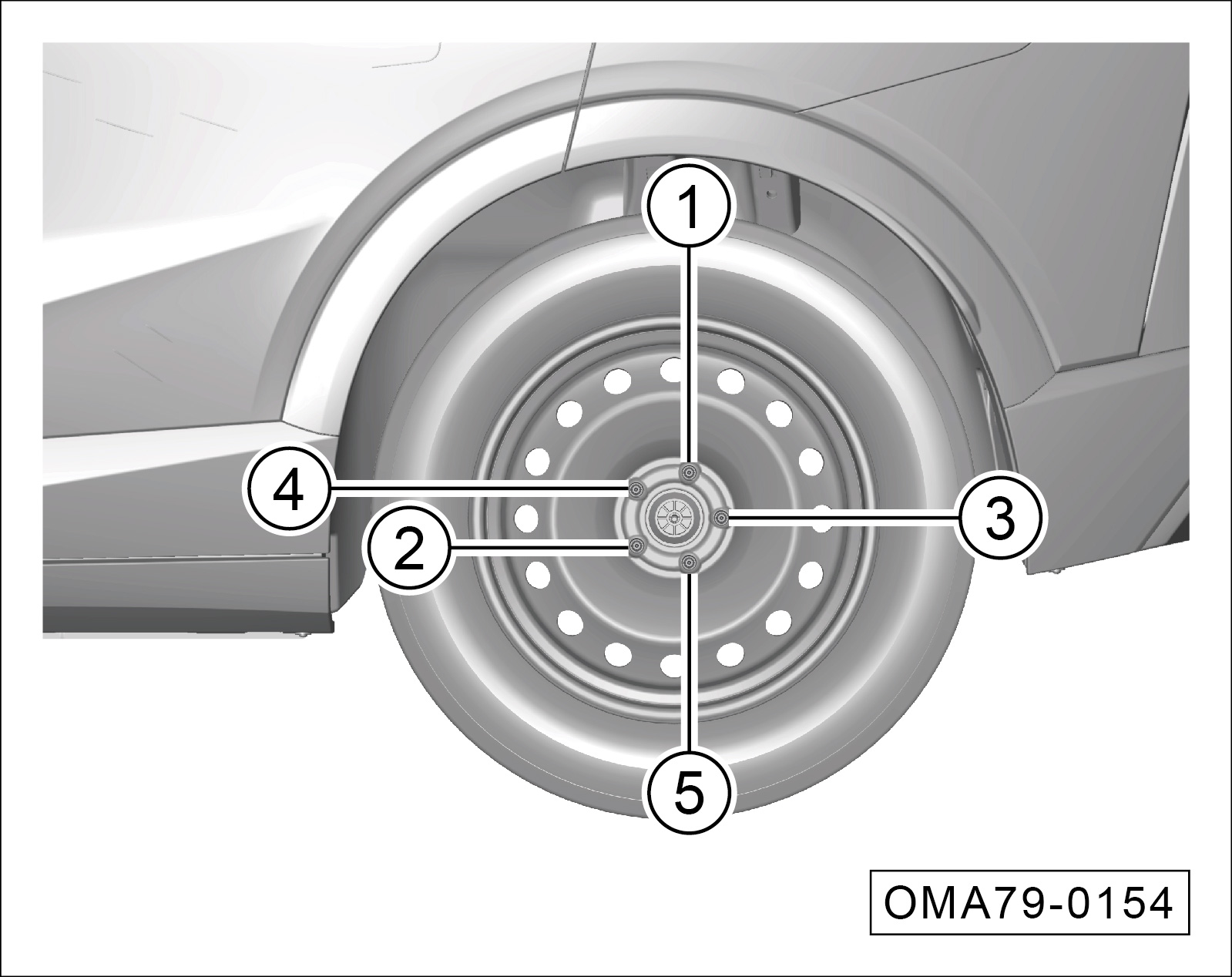 装上所有车轮螺栓,并按图中①~⑤顺序用车轮螺栓拆卸扳手预紧。
