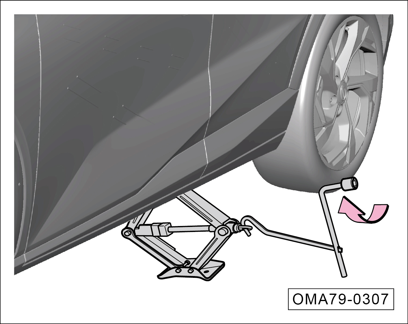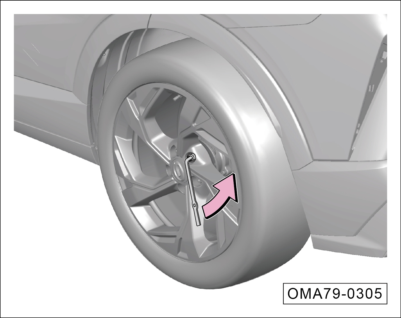 举升车辆前,只需拧松车轮螺栓一圈。举升车辆后,再完全拧出车轮螺栓,然后拆下漏气轮胎。