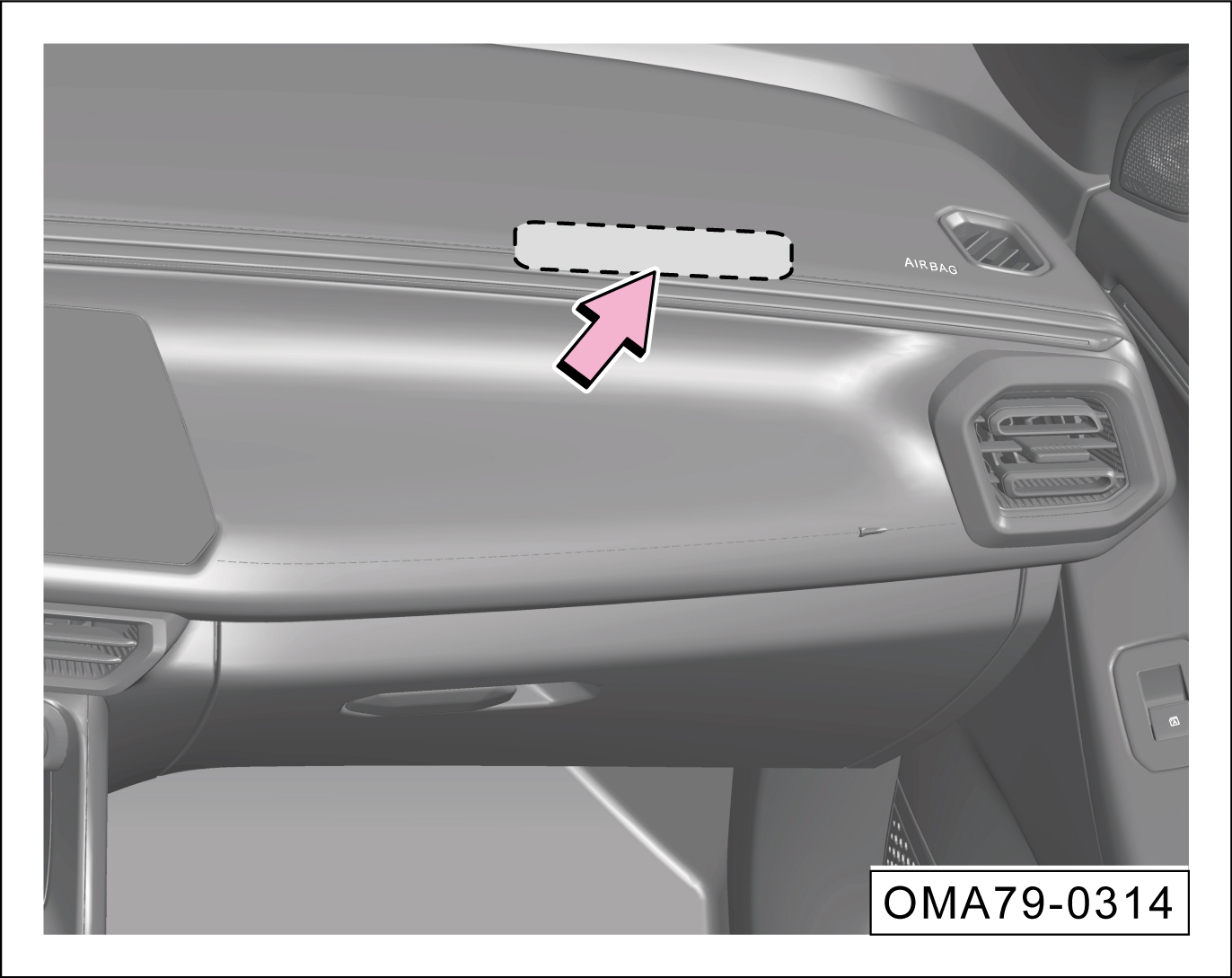 前排乘员正面安全气囊安装在仪表台内部(虚线阴影部分),仪表台上标有“AIRBAG”标志。