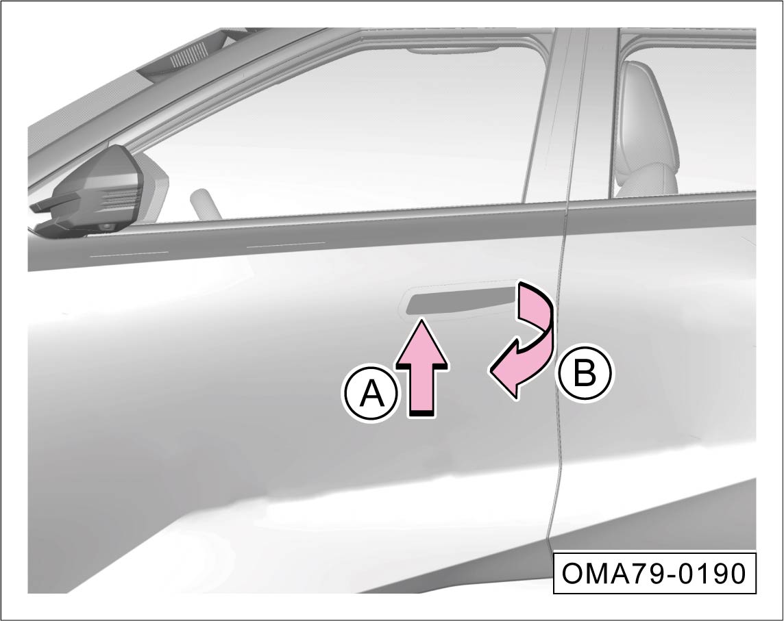 整车解锁,沿-箭头A-方向按压门把手左侧,使门把手右侧弹起,再沿-箭头B-方向拉动门把手即可打开车门。