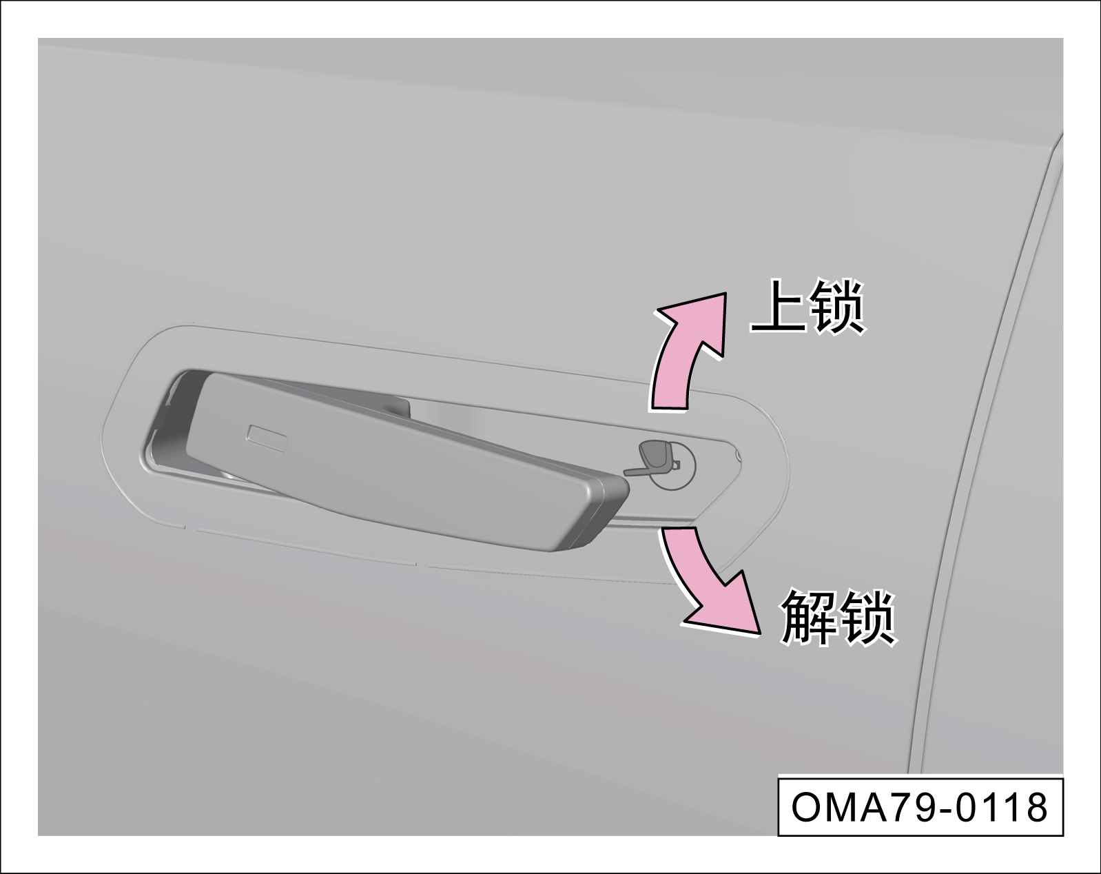 逆时针下压机械钥匙手柄,可解锁主驾车门。