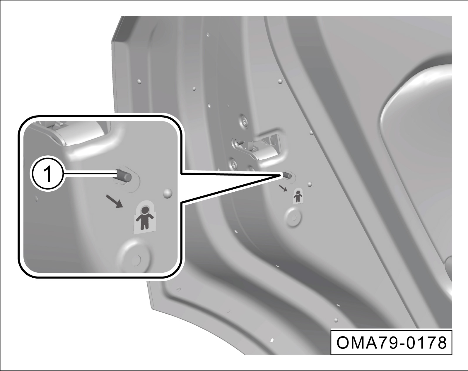 开启:将儿童安全锁开关①沿-箭头-方向拨至上锁位置,开启儿童安全锁。