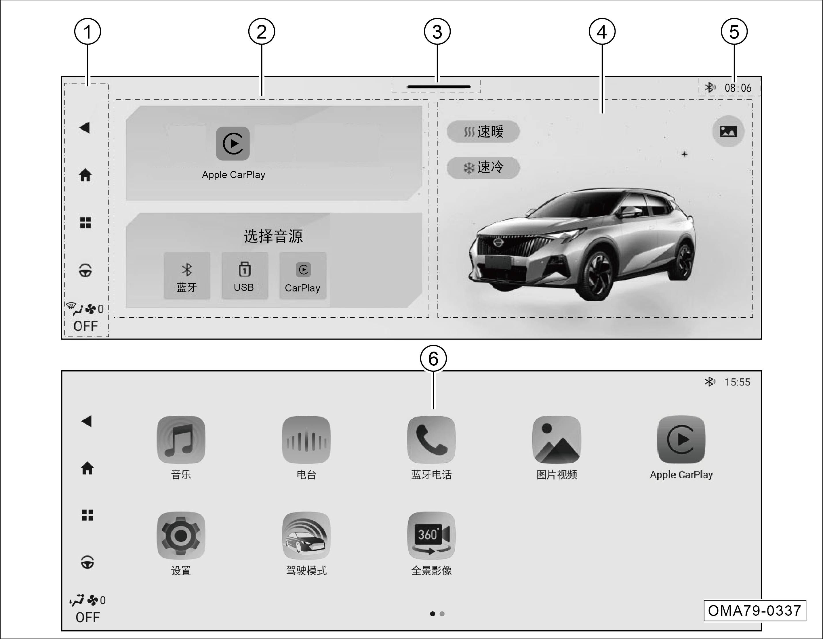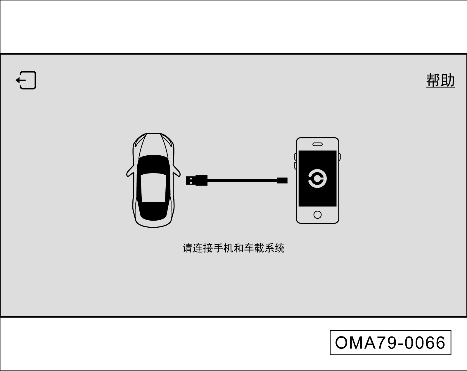 使用USB连接线连接手机和主机的USB连接口,连接成功后系统将自动跳转到CarPlay主界面,系统界面的“Apple CarPlay”图标高亮。