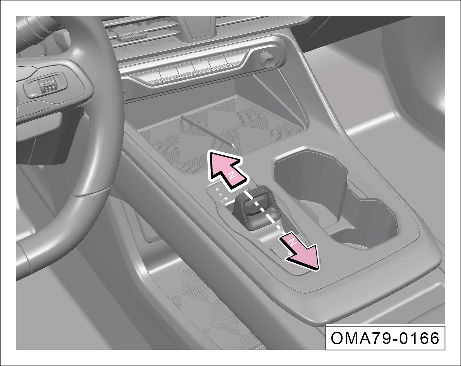 挡位处于“D/S”挡时,踩制动踏板,换挡杆向前推至第一个阻力点位置,挡位将切换至“N”挡。