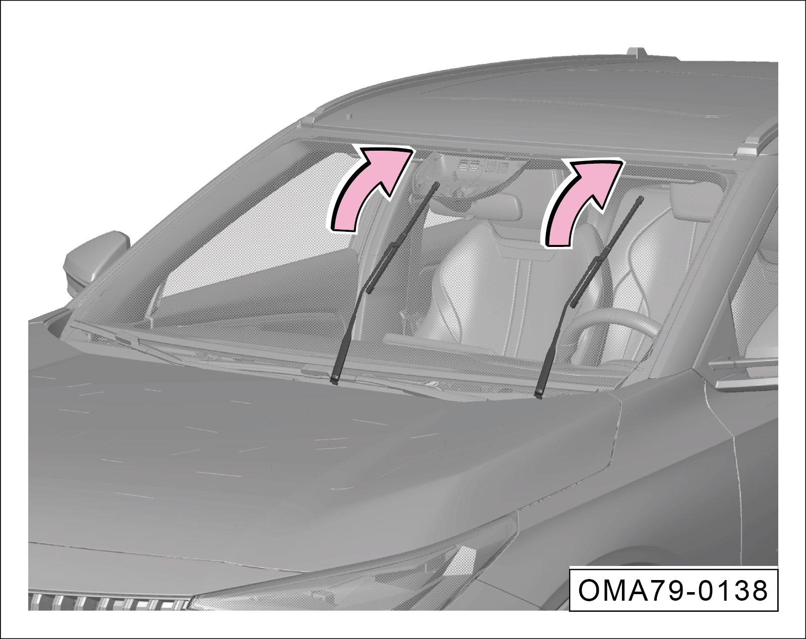 拉起雨刮臂,按压锁止按键-箭头-,拆卸雨刮片。