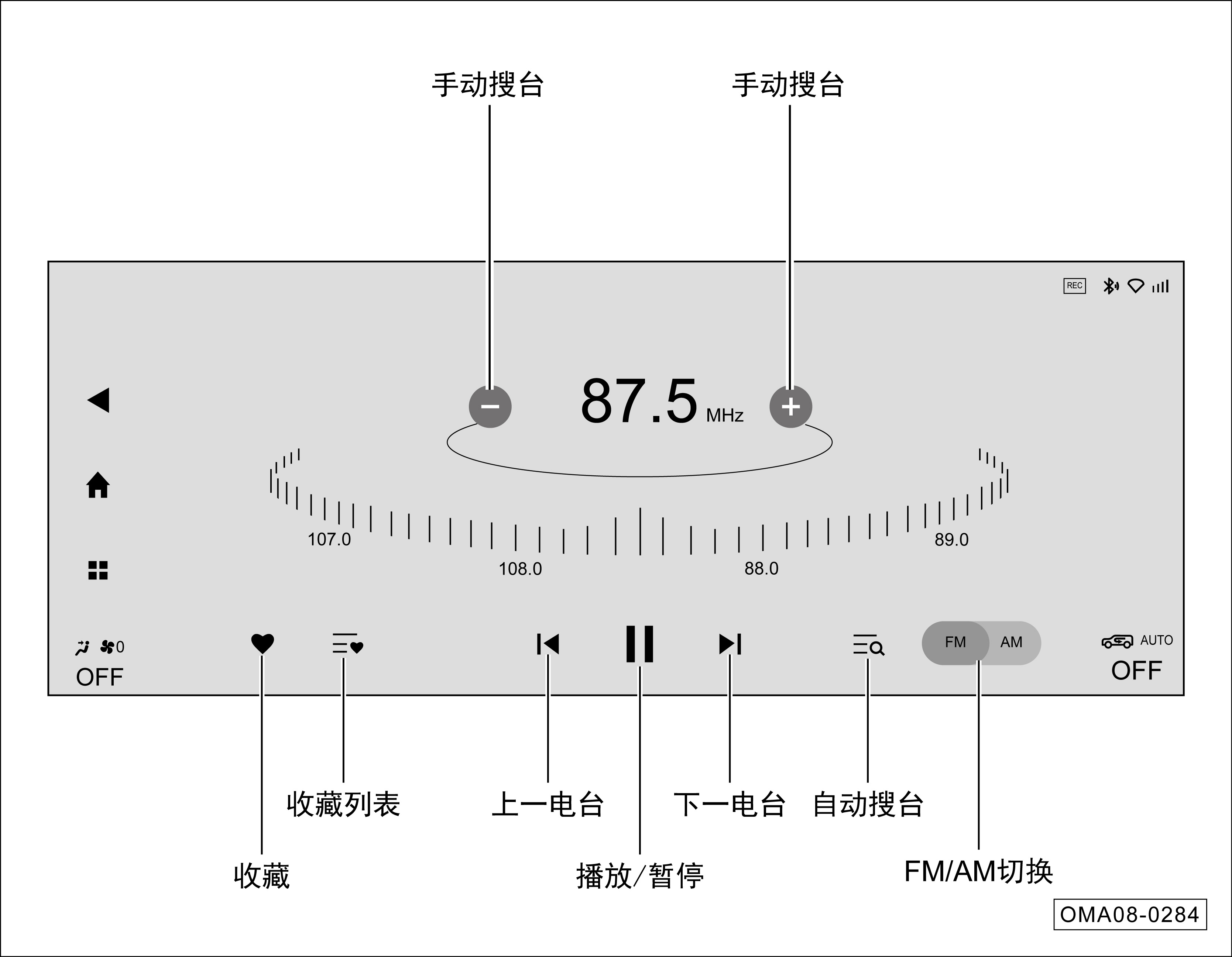 连续短按方向盘左侧“MODE”按键,切换至收音播放界面。