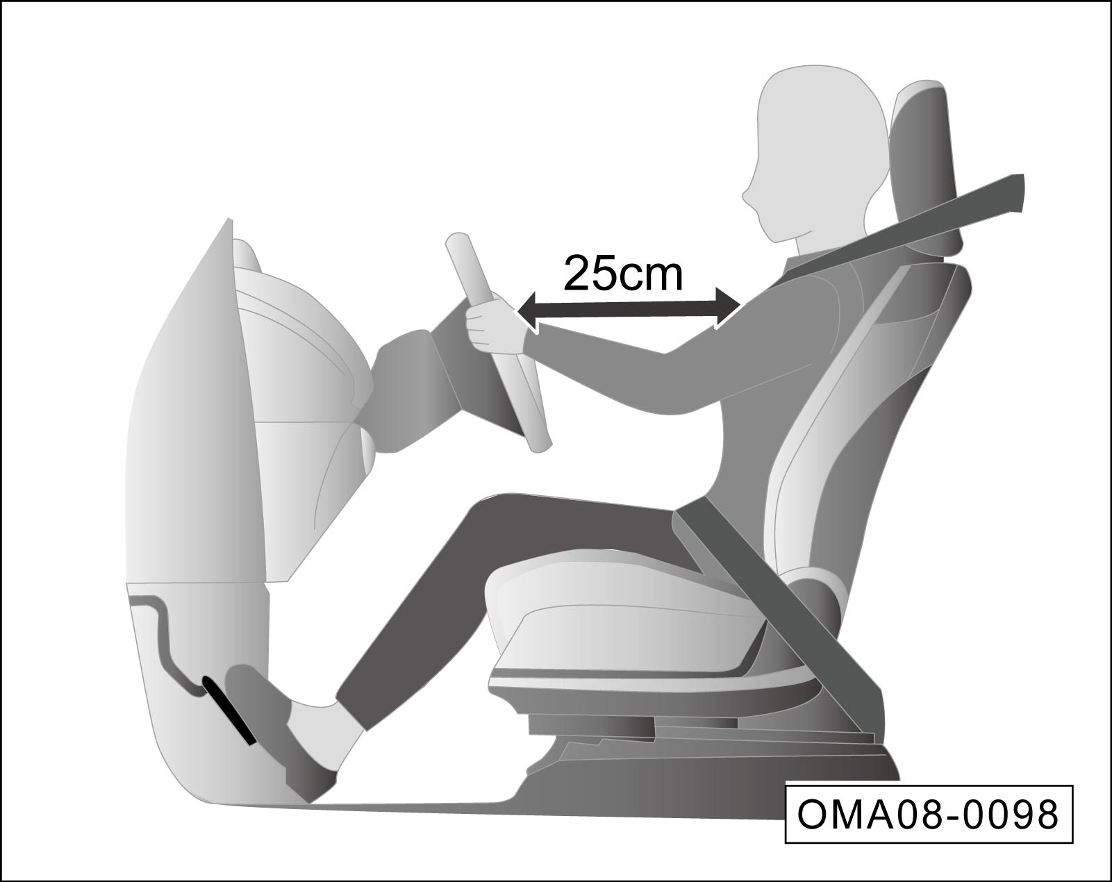将驾驶员座椅调整至合适位置,确保方向盘和胸部之间的距离不小于25cm。