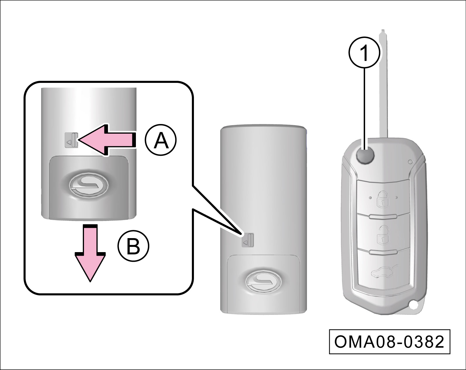 配备一键启动开关*车型的钥匙:沿-箭头A-方向拨开关,同时沿-箭头B-方向拉出应急机械钥匙,可上锁所有车门或解锁驾驶员侧车门,无法启动车辆。