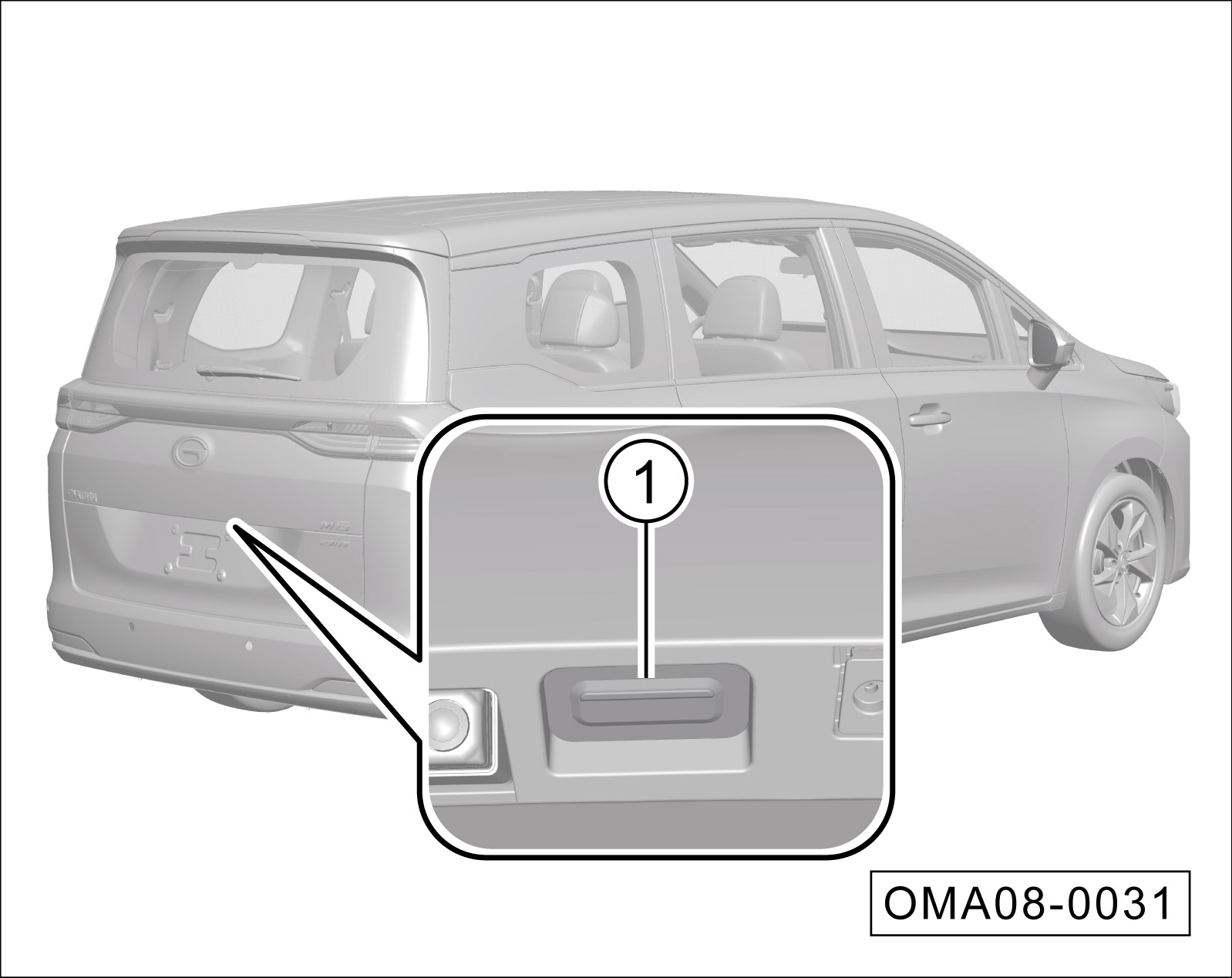 当启动开关在“OFF”挡位时,携带智能遥控钥匙走近掀背门,按压掀背门开启按键①,可解锁并打开掀背门。