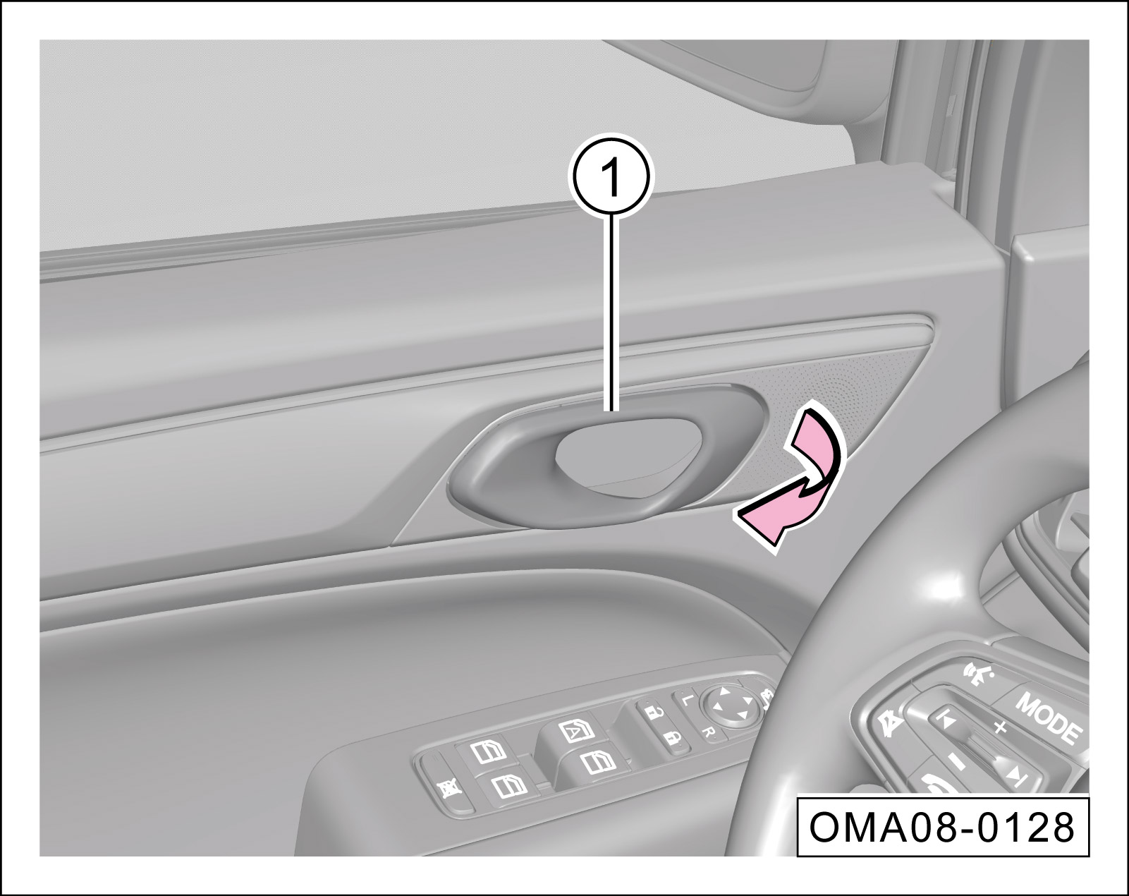 若车辆处于解锁状态,拉动任意一车门内拉手①一次,直接打开该车门。