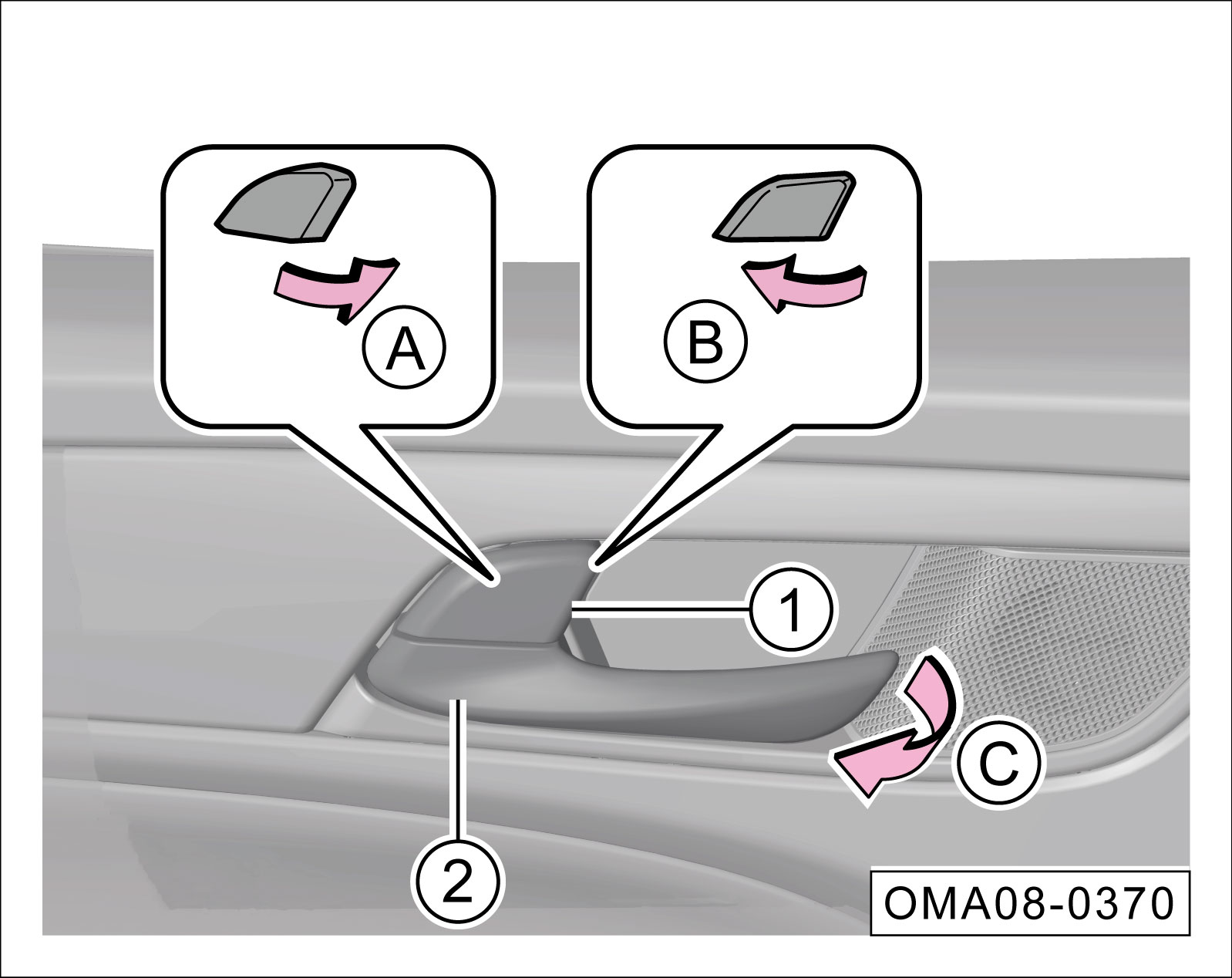 沿-箭头B-方向将车门锁栓①向外拉时,可解锁对应的车门;再沿-箭头C-方向拉车内拉手②,可打开对应的车门。