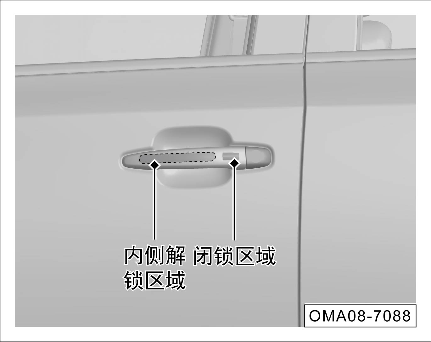 当启动开关在“OFF”挡位时,携带智能遥控钥匙离开车内,将所有车门关闭后,触摸闭锁区域,有效感应后所有车门闭锁。