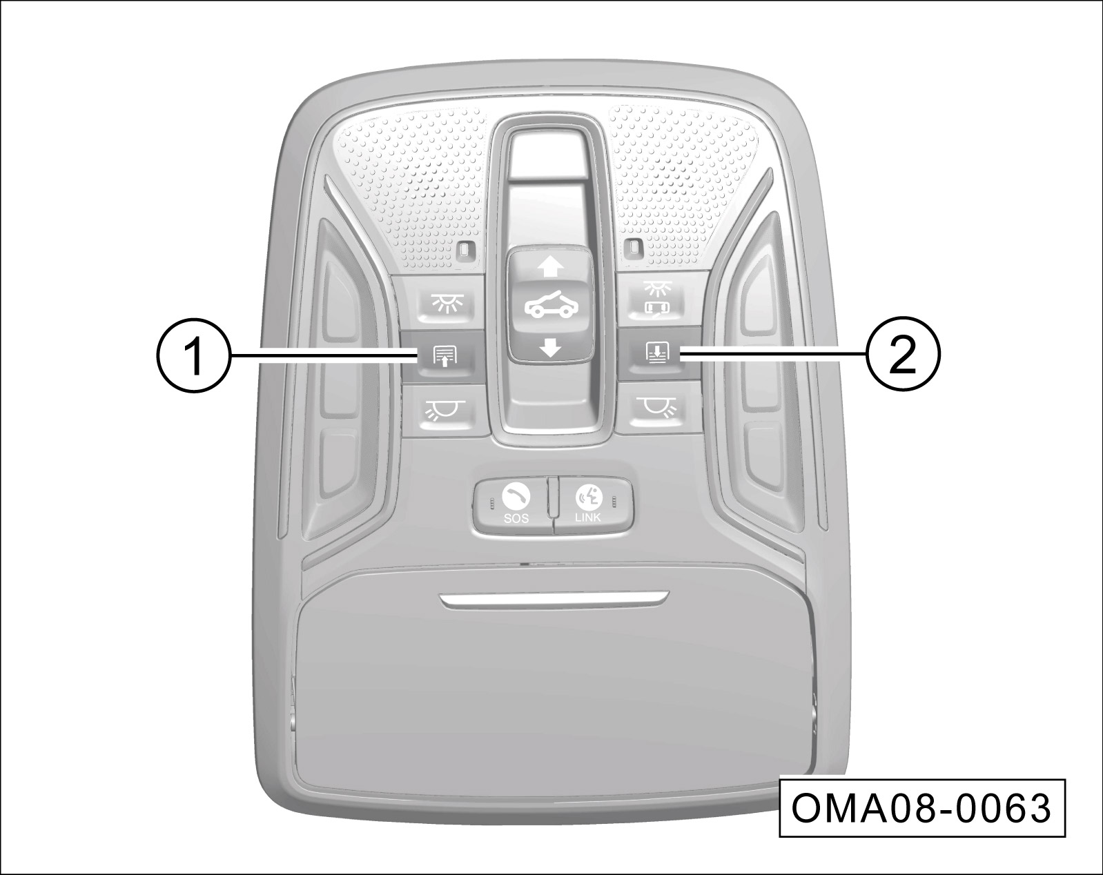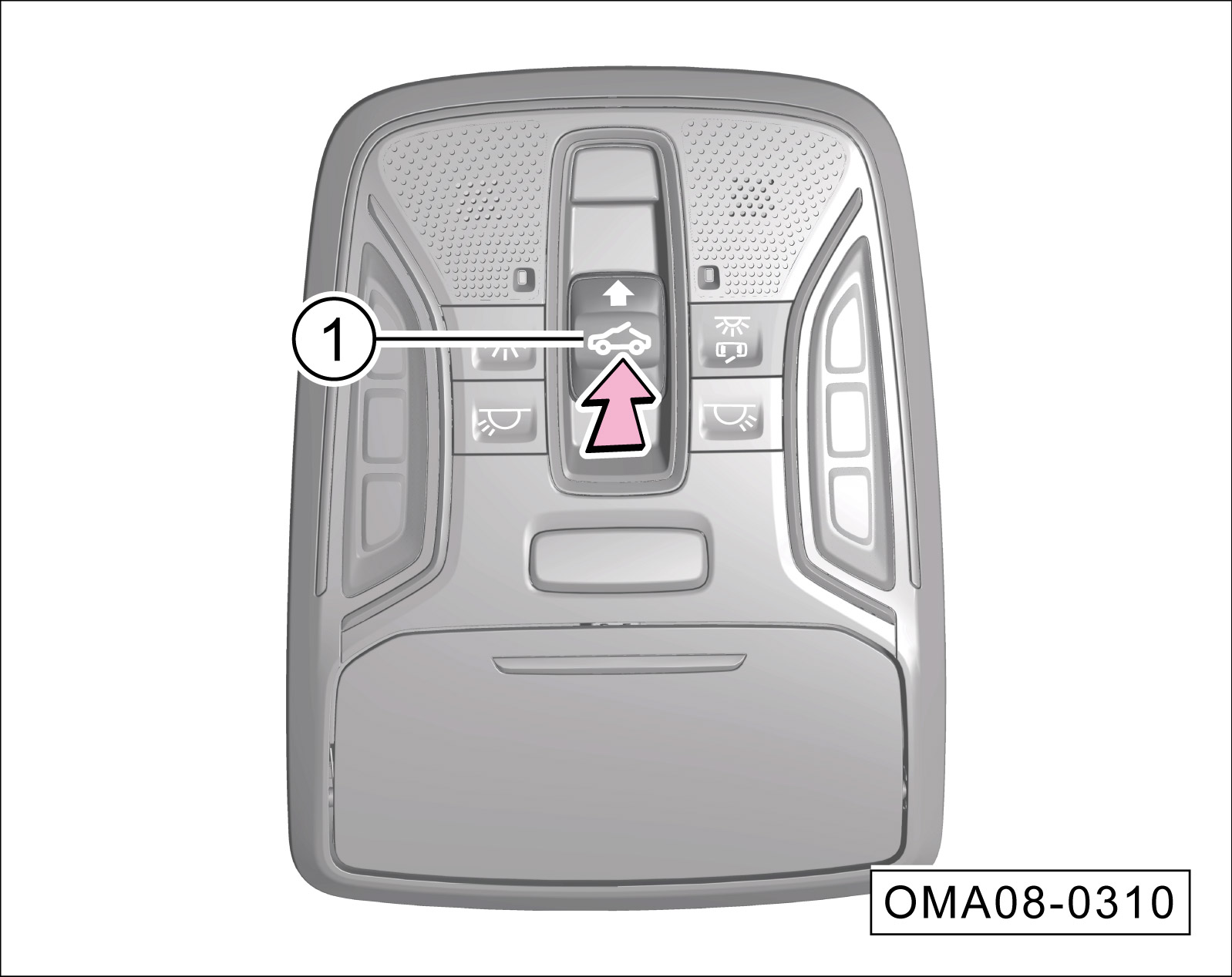 当天窗处于完全关闭状态时,手动打开遮阳板(适用于普通天窗),按压天窗开关①的