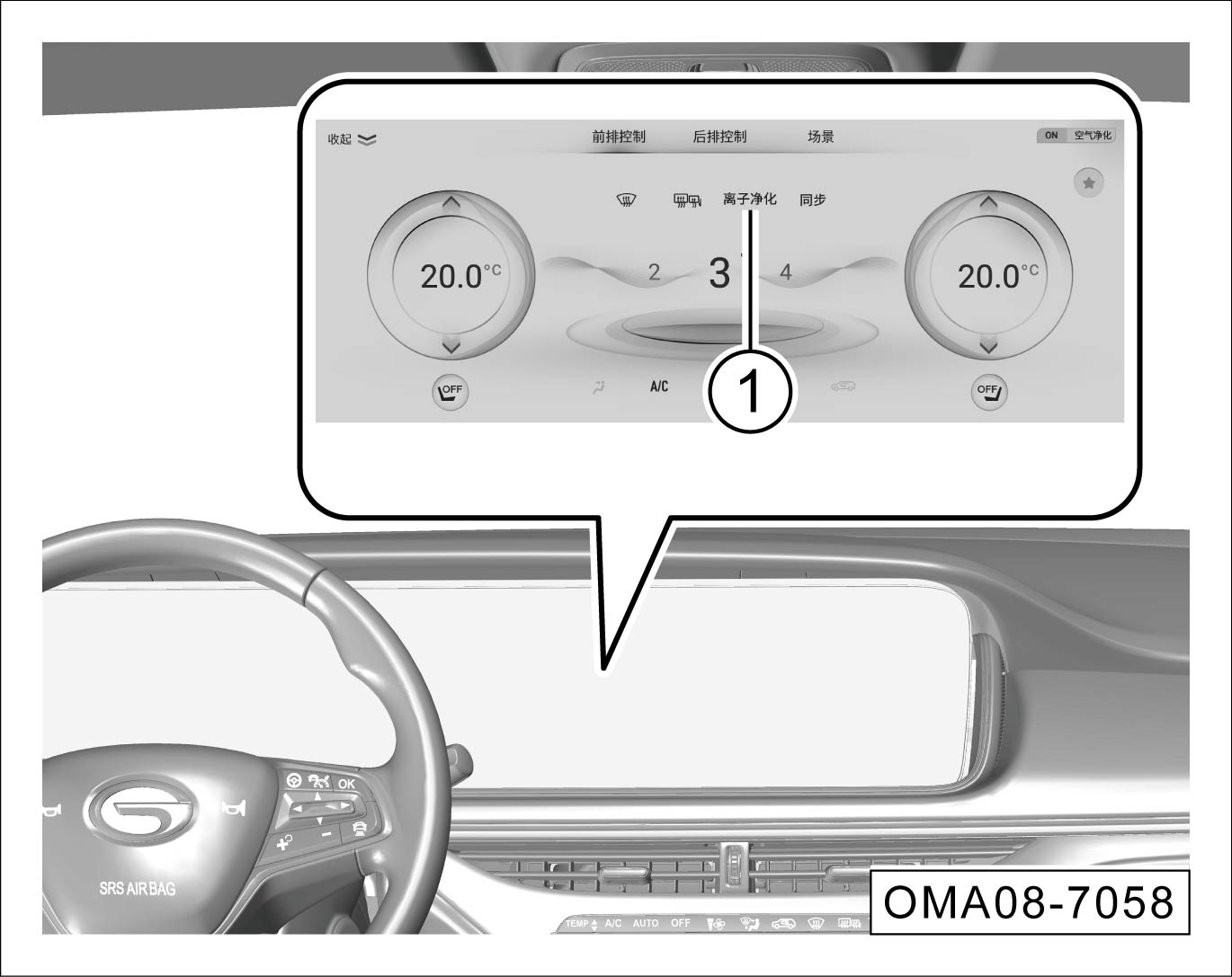 音响系统切换到空调系统控制界面,点击离子净化软按键①,软按键指示灯灯点亮,空调系统开启等离子空气净化器。可以产生等离子,有效分解车内甲醛、苯等有害气体,净化车内空气。