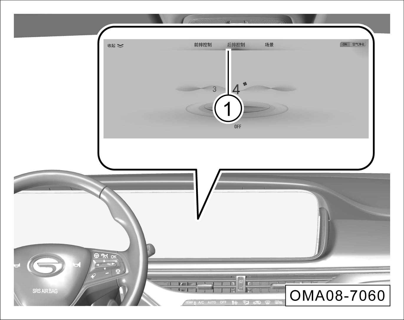 音响系统切换到空调系统控制界面,点击“后排控制”软按键①,切换到后排空调控制界面,空调系统开启前排控制后排的以下功能: