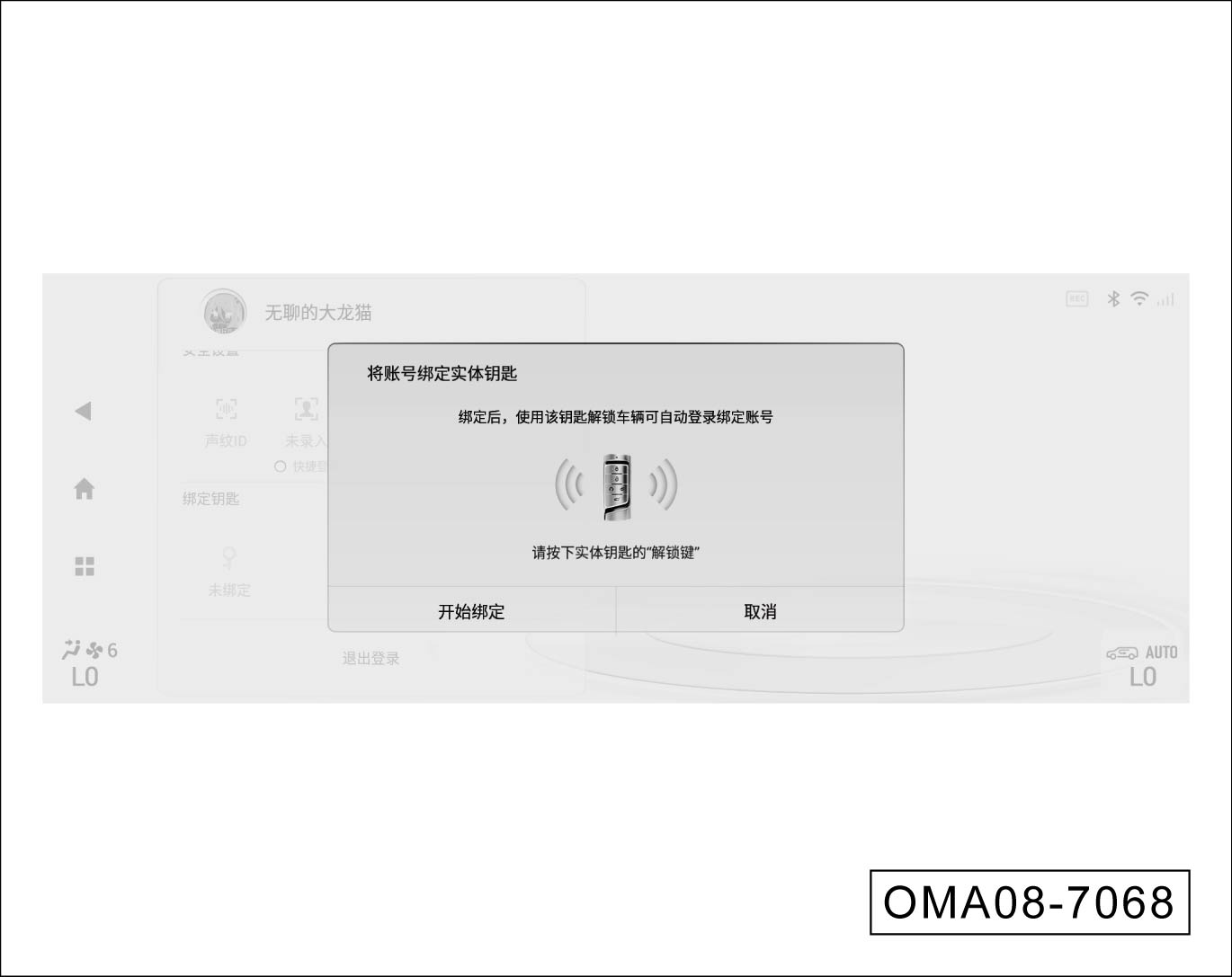 用户在个人中心页面,点击“绑定钥匙”软按键,绑定后将账号ID同实体钥匙绑定,使用该钥匙靠近解锁车辆可执行个性化迎宾且自动登录该绑定账号(需整车处于休眠状态时解锁才有效)。