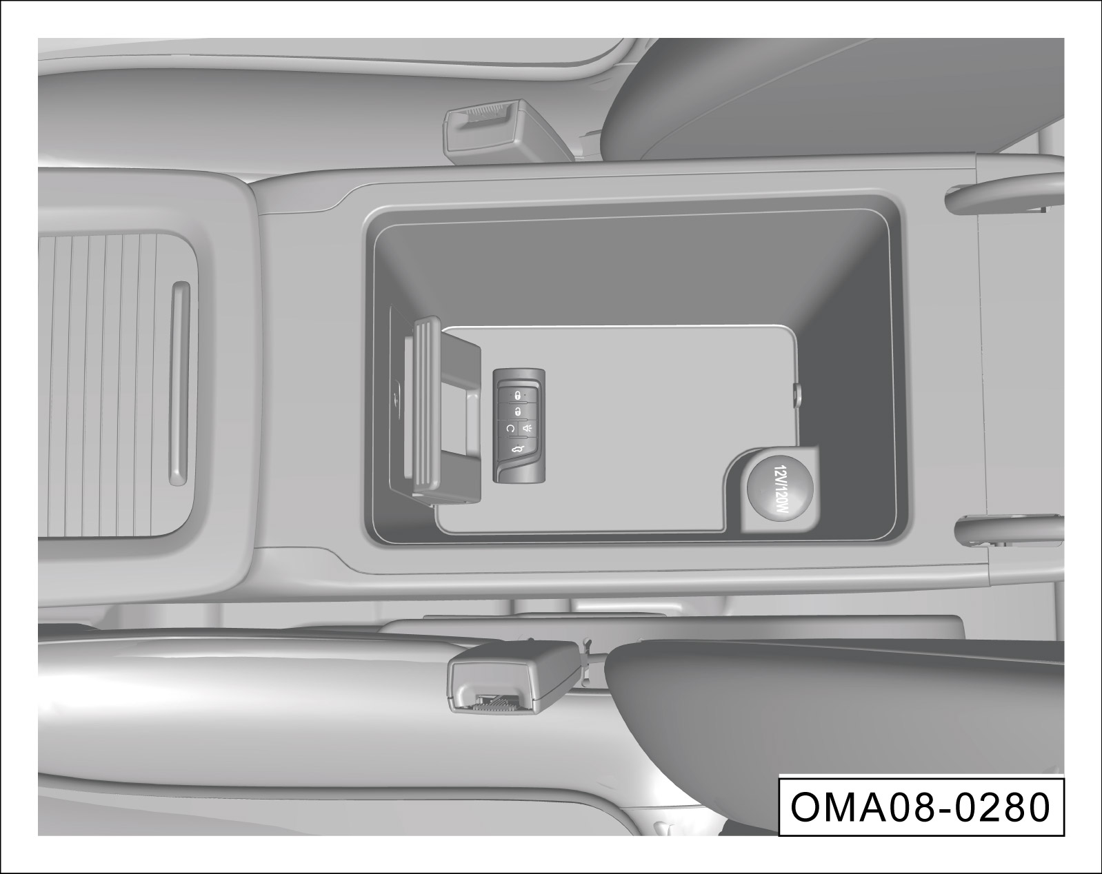若由于智能遥控钥匙电池电量低,组合仪表显示屏提示“未检测到钥匙”时,可尝试把智能遥控钥匙水平放在扶手箱底部(图示位置),然后按启动开关切换到“ACC”或“ON”挡位,或踩下制动踏板,启动开关指示灯变为绿色后,按启动开关,启动发动机。