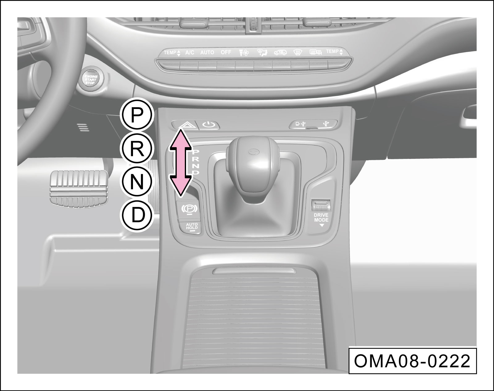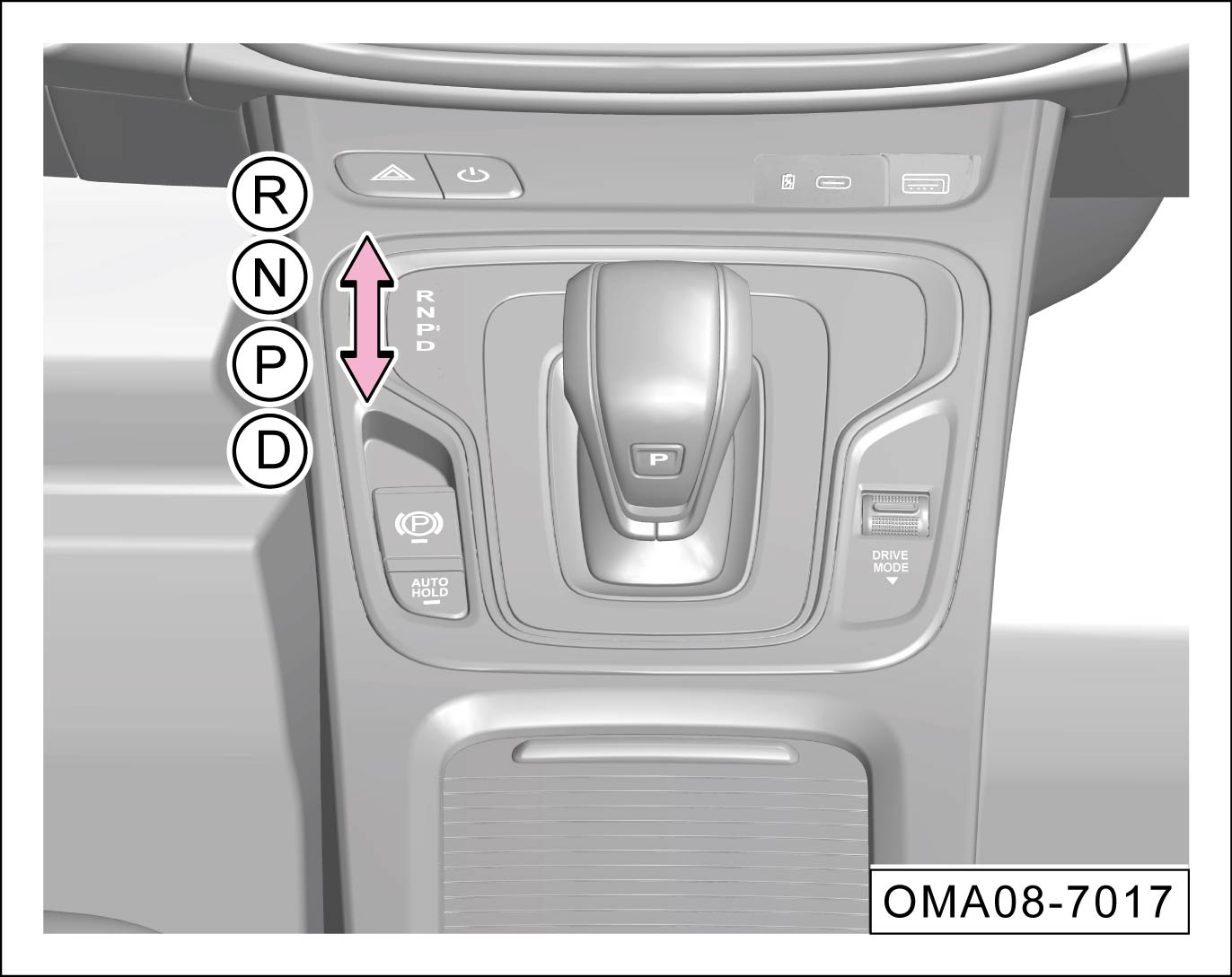 踩下制动踏板,将换挡杆向后拉动,可从“P”、“N”、“R”挡位挂入“D”挡。