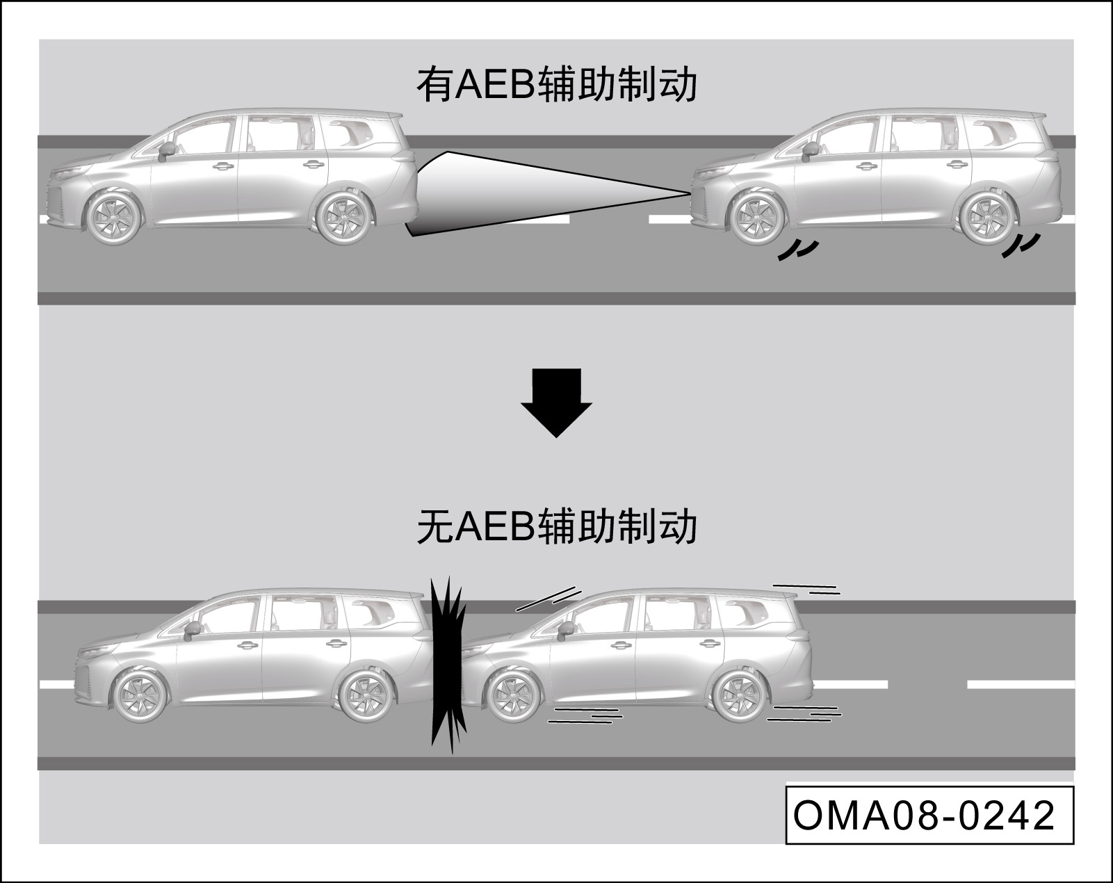 AEB系统仅能实现有限的制动减缓碰撞伤害,不可能自主防止车辆发生事故或防止人员受伤,因此在AEB系统工作时,务必根据情况实施制动。