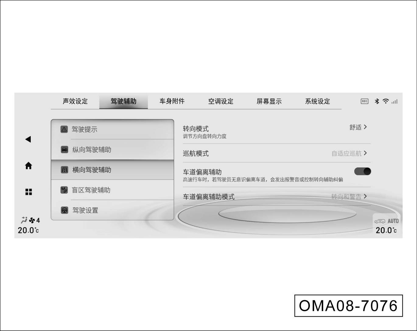 启动开关在“ON”挡位时,进入音响系统,切换至“系统设置→驾驶辅助→横向驾驶辅助”界面,短按“车道偏离辅助”右侧的
