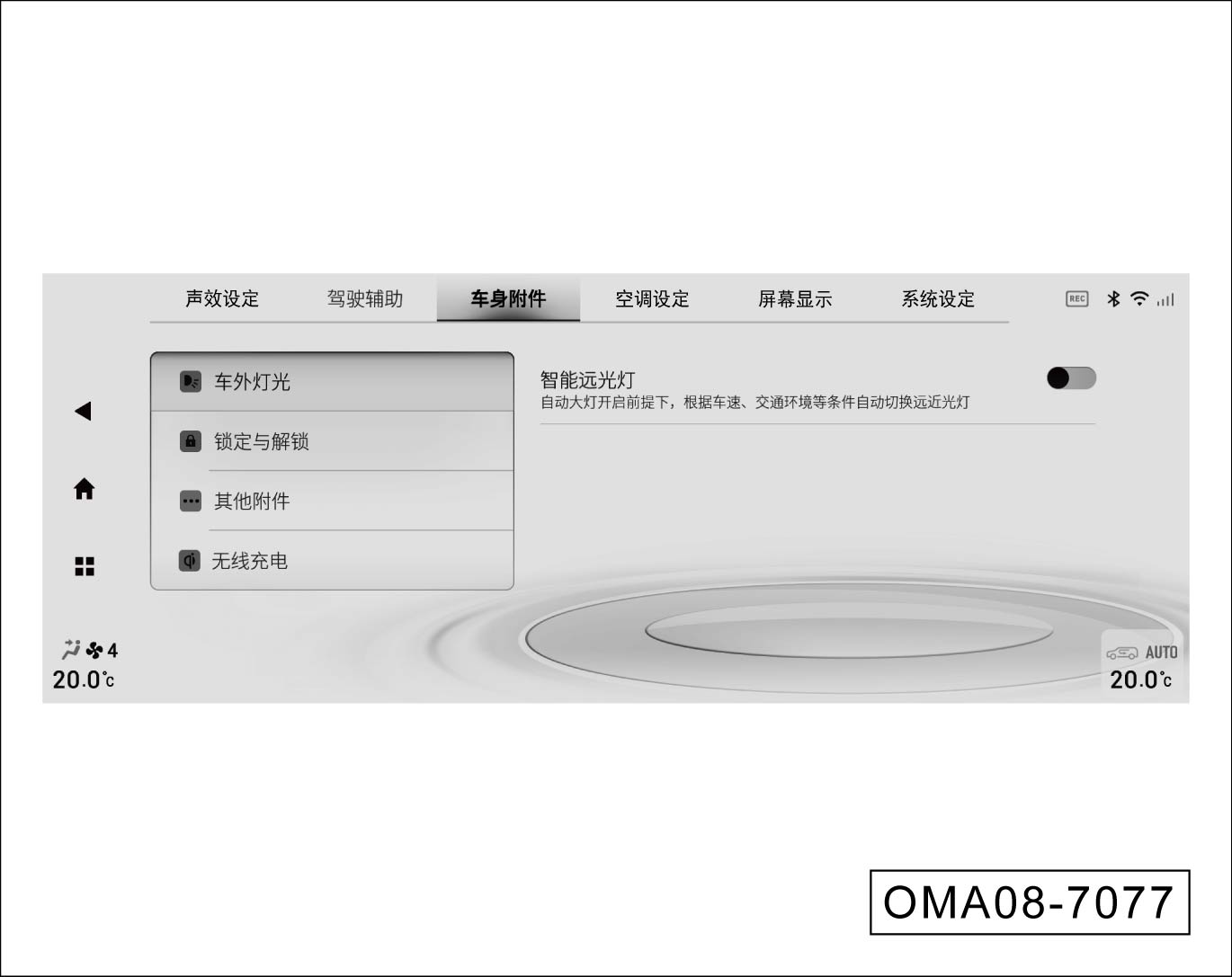 启动开关在“ON”挡位时,进入音响系统,切换至“系统设置→车身附件→车外灯光”界面,短按“智能远光灯”右侧的