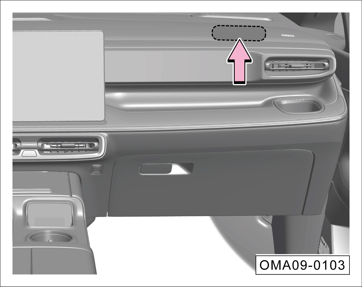前排乘员正面安全气囊安装在仪表台内部(虚线阴影部分),“AIRBAG”为安全气囊标志。