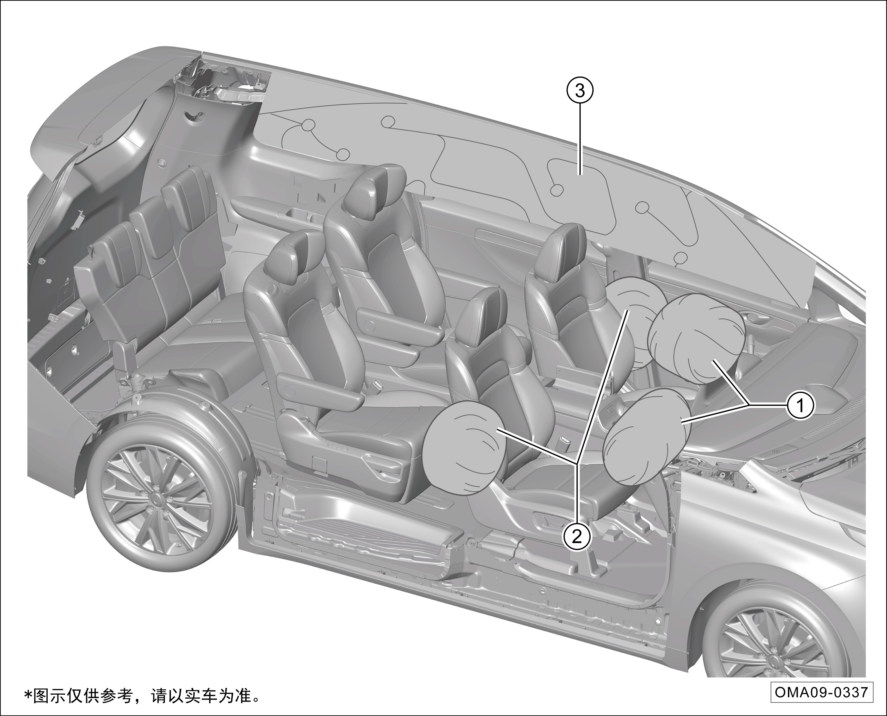 ③ 侧窗帘式安全气囊(左右对称)