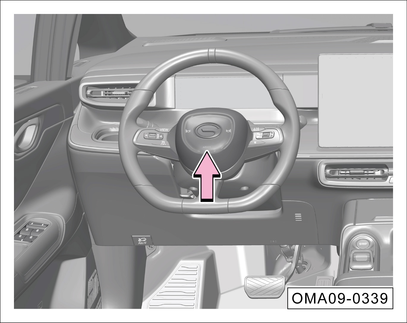 驾驶员正面安全气囊安装在方向盘内部(阴影部分),“AIRBAG”为安全气囊标志。