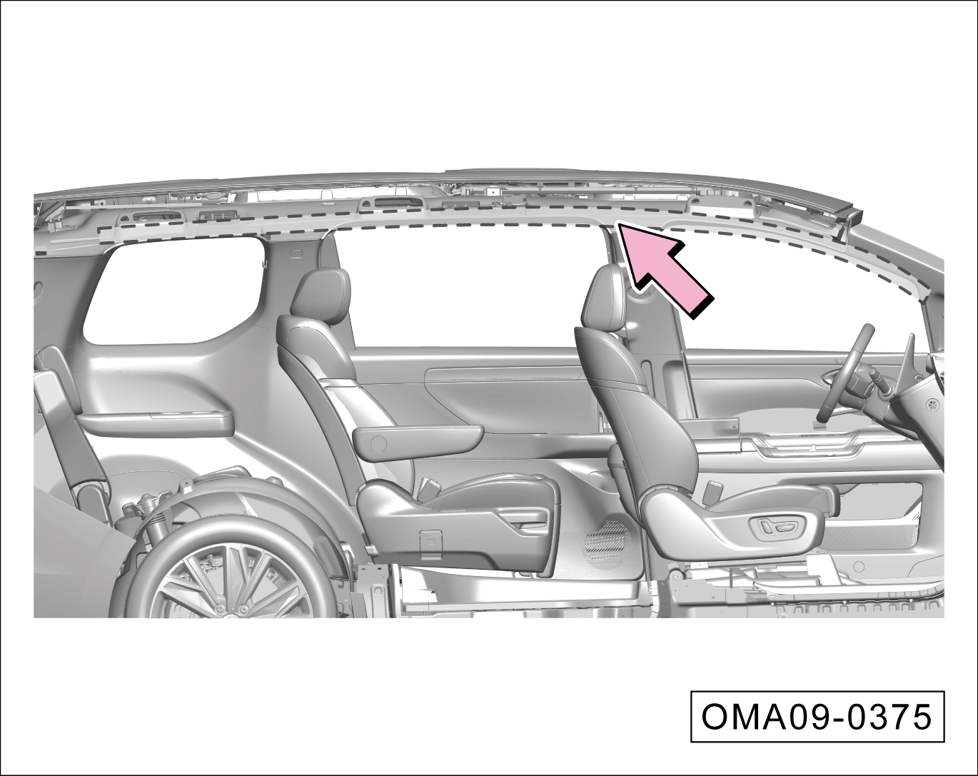 侧窗帘式安全气囊安装在顶棚左、右两侧内部(虚线阴影部分),“AIRBAG”为安全气囊标志。