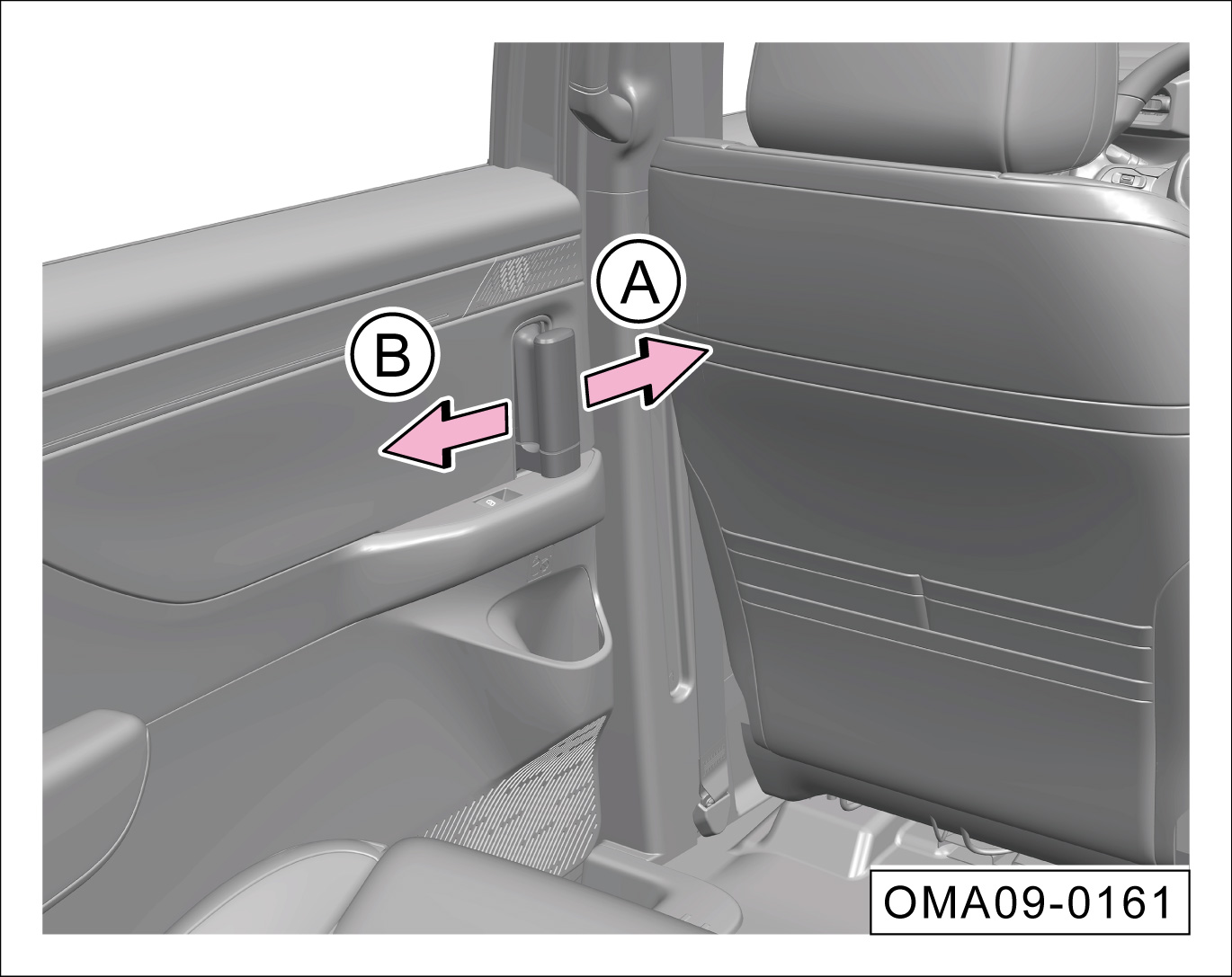 在滑移门全闭状态下,车门锁栓和儿童安全锁均处于解锁状态时,沿-箭头B-方向拉动内把手,开启对应侧滑移门。