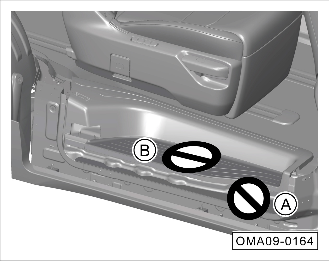 滑移门开启或关闭过程中,B区域滑移门门槛踏板处禁止放置物品或者乘员将脚放在该区域。