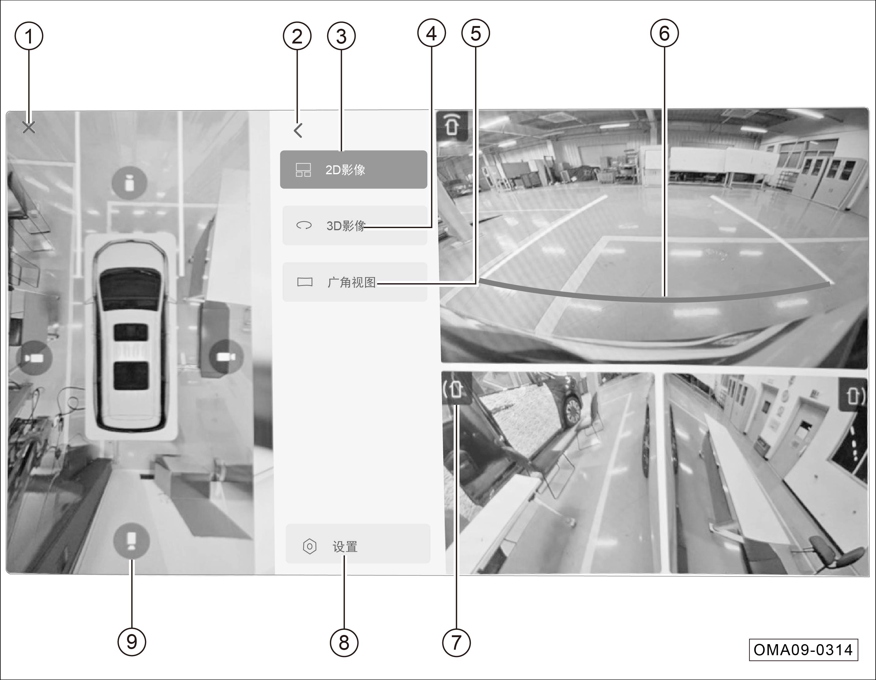 绕车环视影像:车辆启动后,首次点击进入全景影像,会在右侧多视角界面显示环视车辆一周画面。