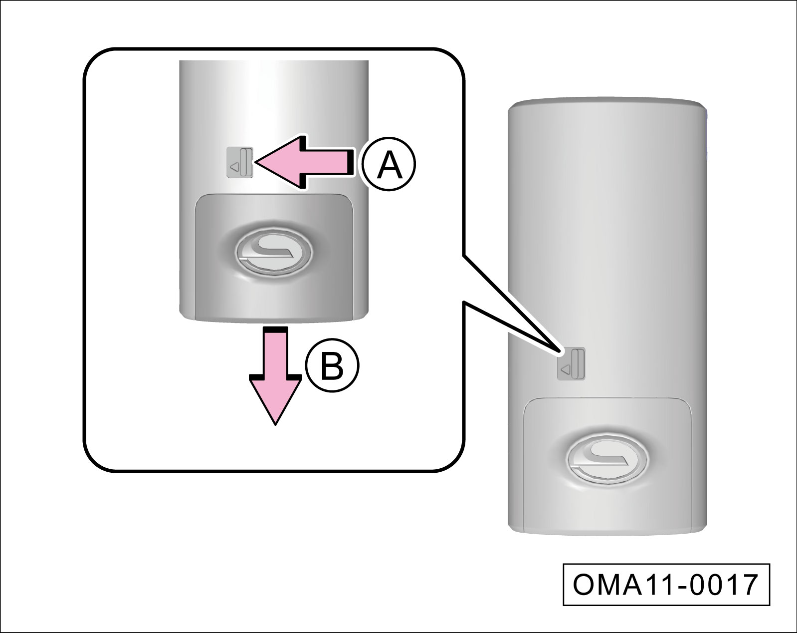 沿-箭头A-方向拨开关,同时沿-箭头B-方向拉出应急机械钥匙。