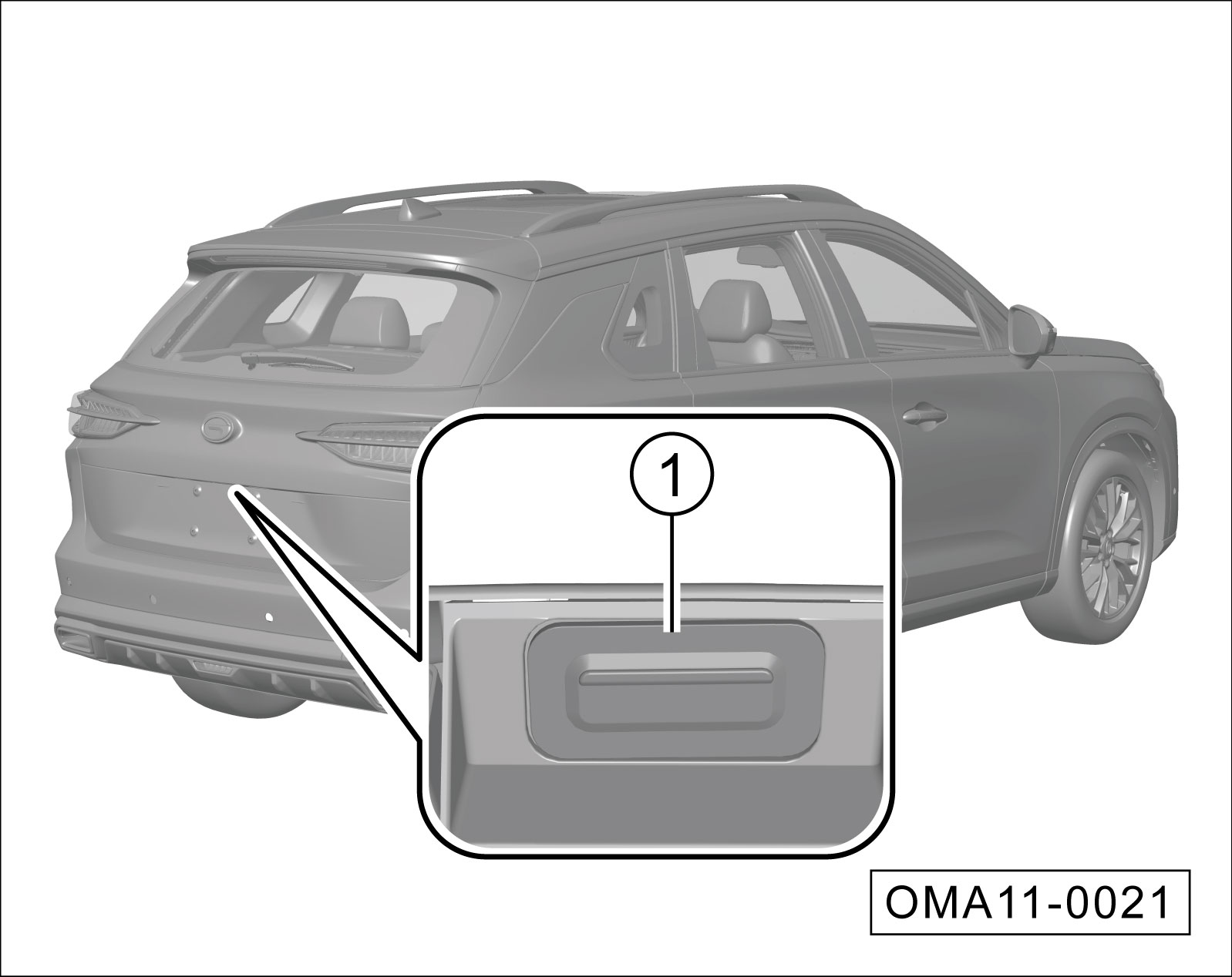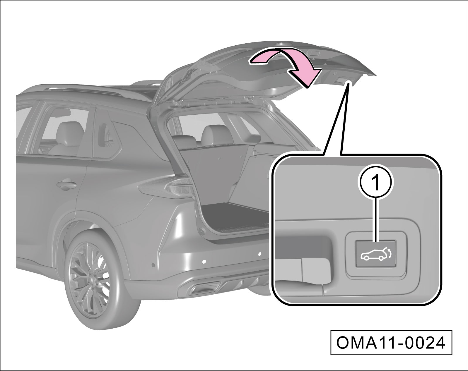按后背门内部按键①,电动后背门会自动下降直到吸合关闭。在关闭过程中,再次按该按键,电动后背门会停止在当前位置。