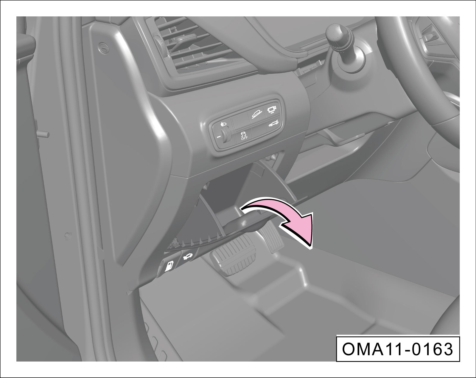 沿-箭头-方向打开驾驶室下护板储物格并抽出,可见仪表板电器盒上面的保险丝。