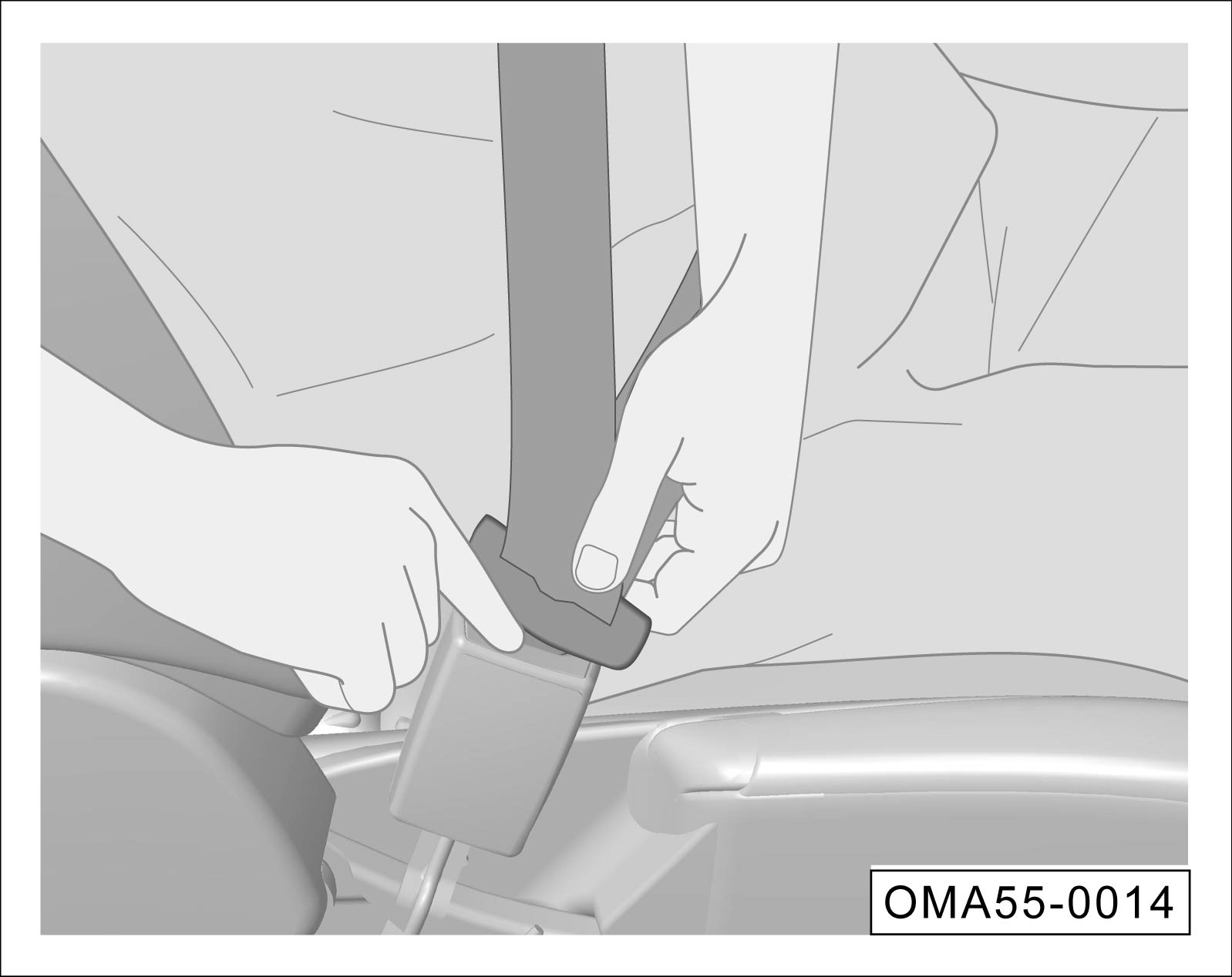 平行于上身向上拉安全带的肩带部分,张紧髋部安全带,并确保锁舌正确啮合。