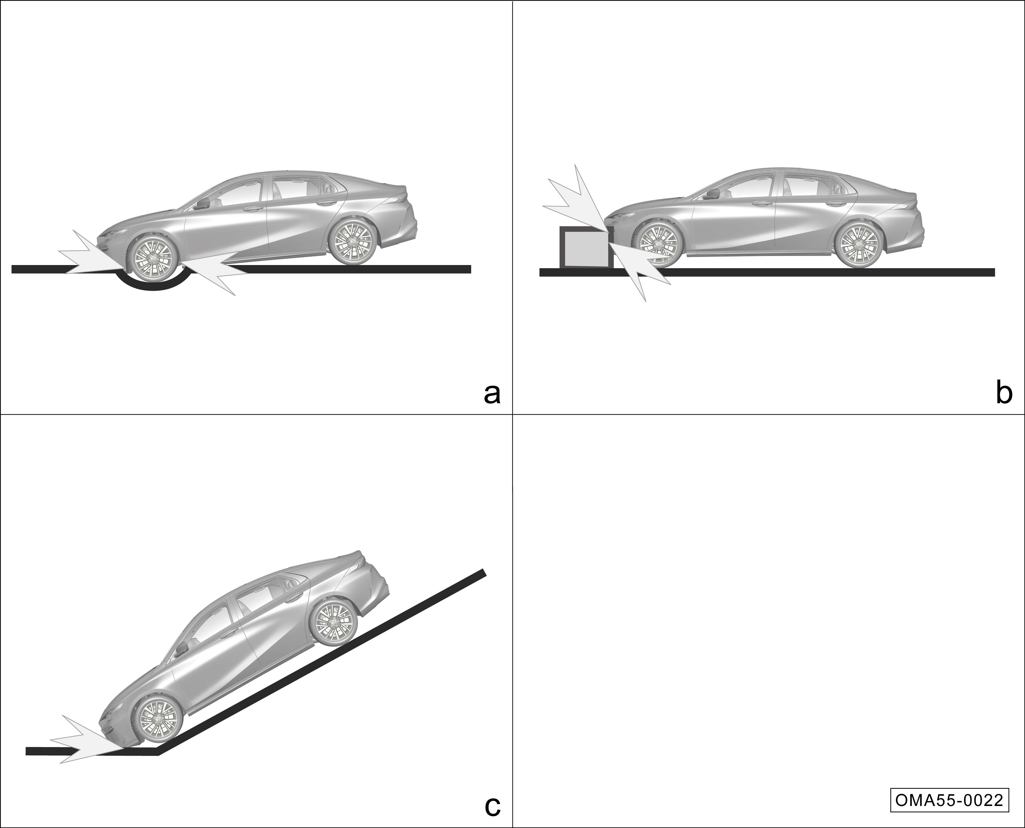 a.越过较深凹槽时,车头撞击地面。