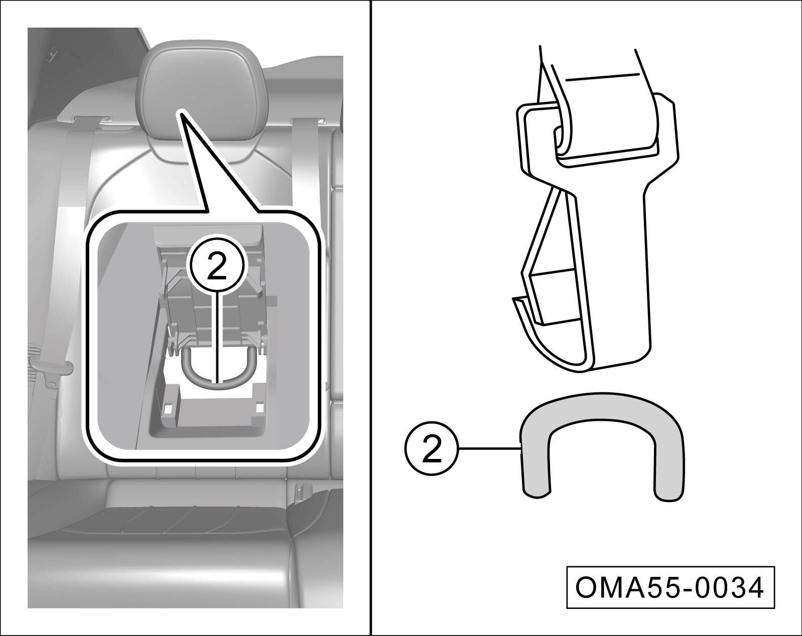 将紧固带穿过头枕支柱,掀开上固定点②的保护盖,并将紧固带钩勾住后固定点②,确保紧固带未扭曲。