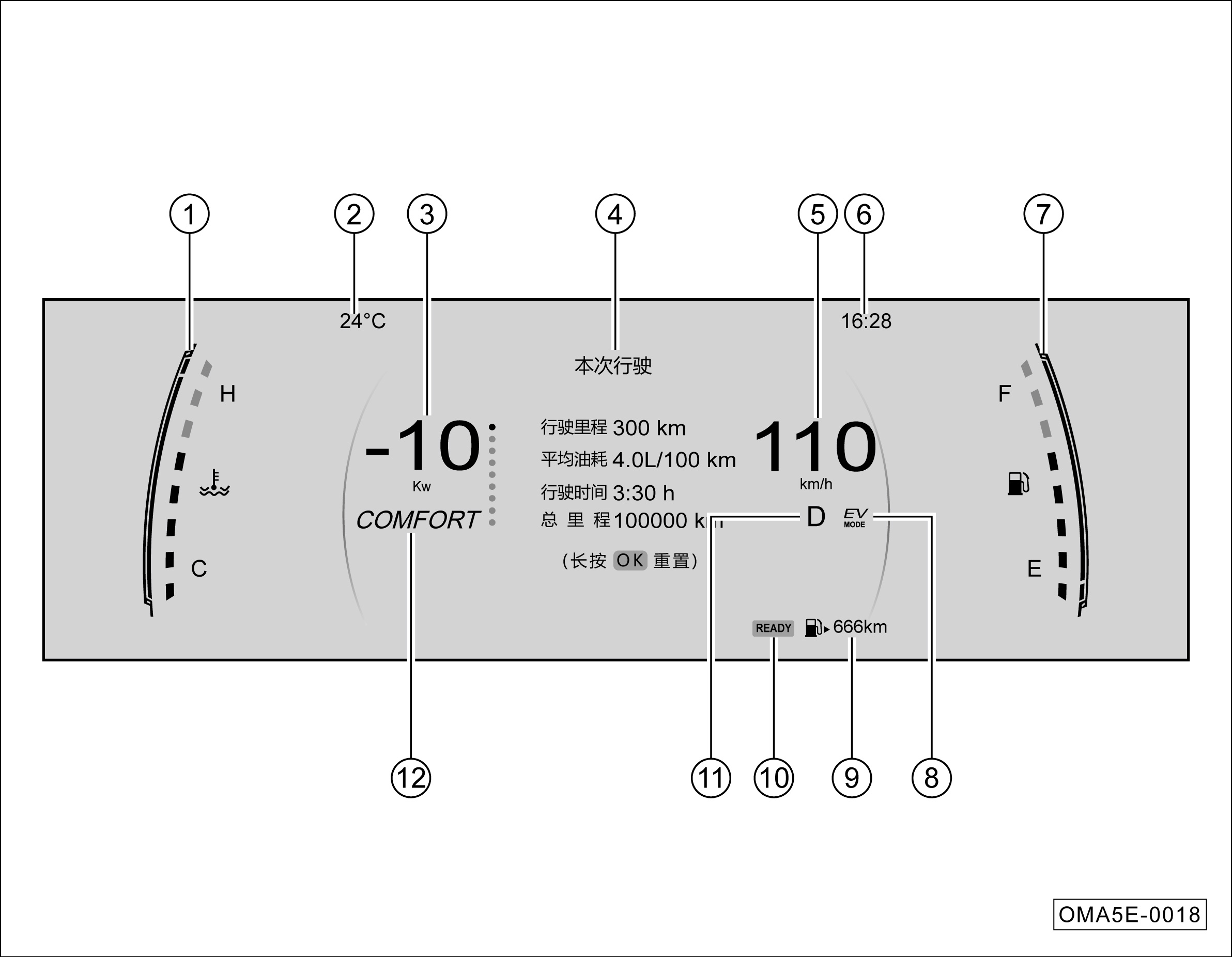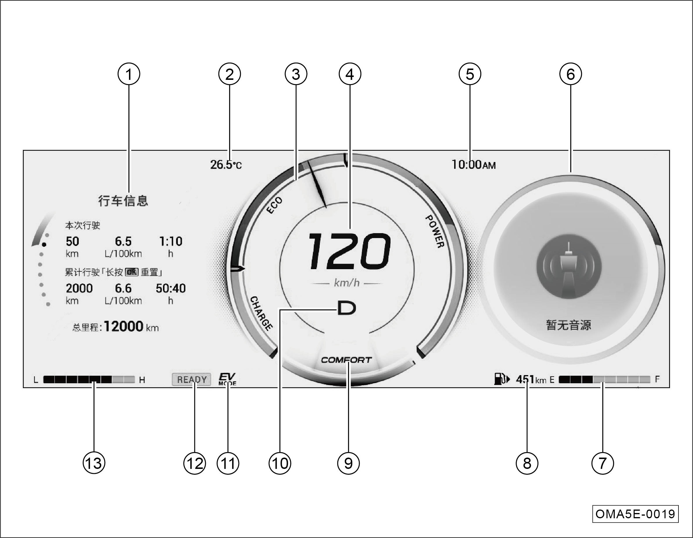 显示信息包括:行车信息、G值表、计时器*、车辆状态、能耗趋势图、导航信息*、驾驶辅助*、报警中心、能量流、发动机转速及音响娱乐等信息。